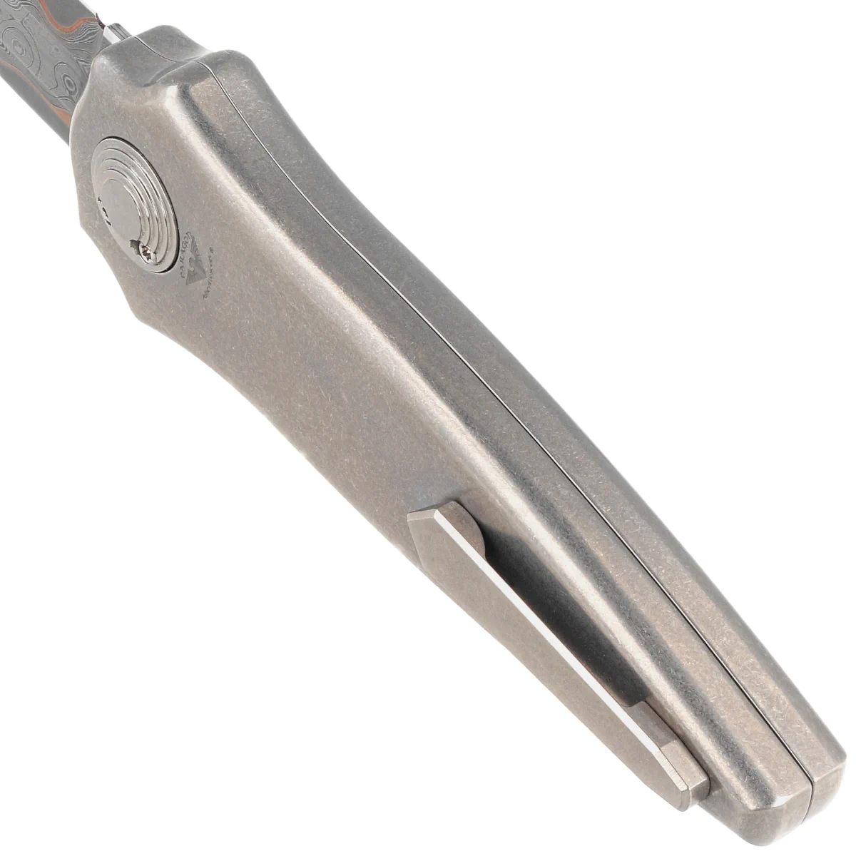 - Warlock Smooth Gray Titanium, Baker Forge Raindrop Gomai Copper Shim 80CRV, duży nóż składany z nietypowym sposobem otwierania grawitacyjnego. Okładziny z tytanu, głownia z pięknego damastu wykutego w kuźni Baker Forge.