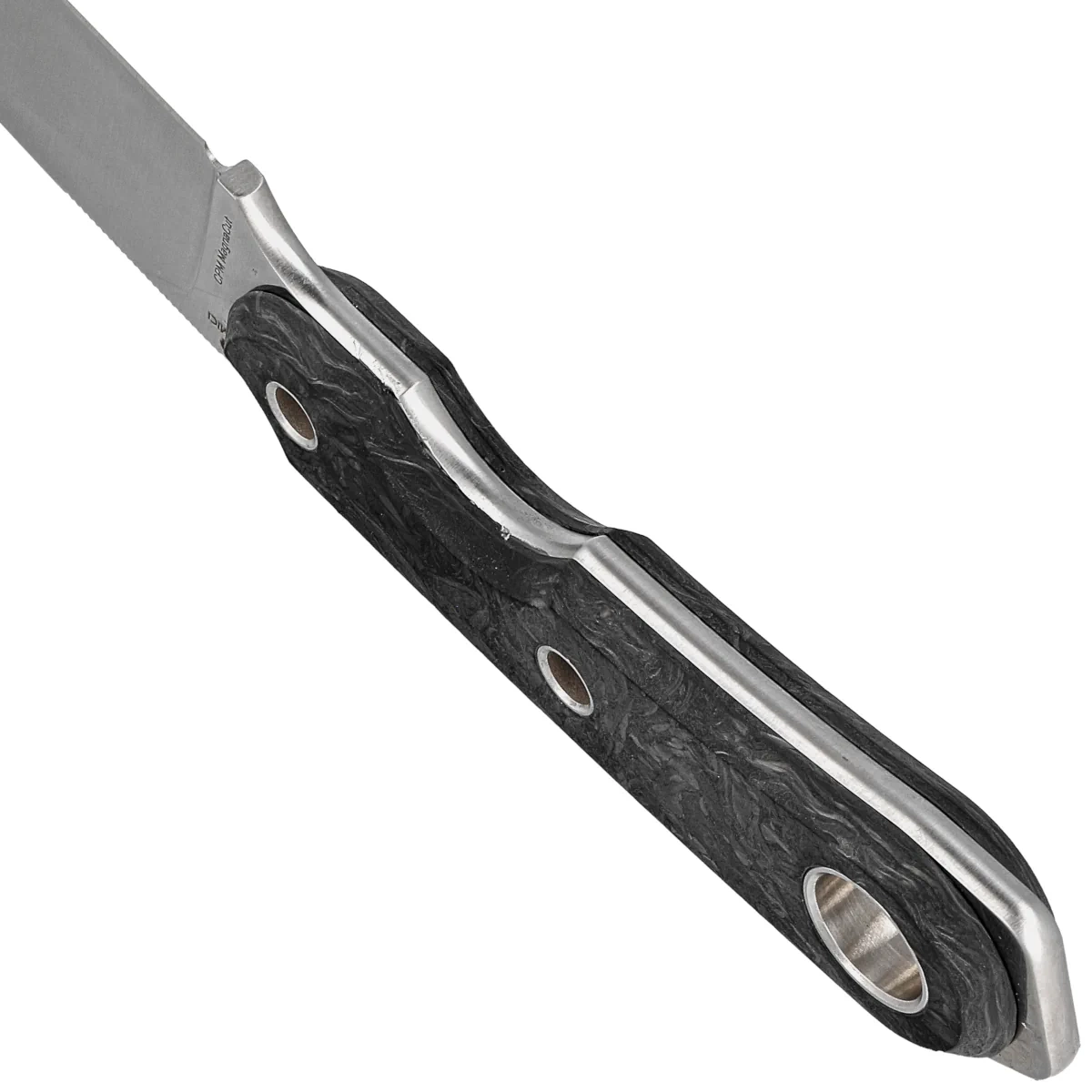 Rękojeść - z kompozytu Dark Matter Carbon Fiber, nitowanego bezpośrednio do blanka, zapewnia praktycznie niezniszczalną konstrukcję. Zaoblony kształt okładek eliminuje ostre krawędzie. Wyjątkowa ergonomia rękojeści umożliwia trzymanie noża w obie strony, specjalnie dla użytkowników, ceniących odwrócony uchwyt. Z tyłu rękojeści powiększony lanyard hole, czyli otwór do zamocowania linki asekuracyjnej. Wystający fragment tanga może służyć do rozpalania ognia przy pomocy krzesiwa lub jako zbijak co szyb.