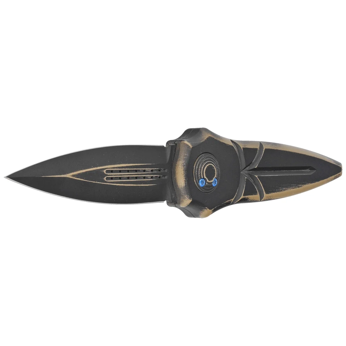 Głownia - typu Dagger, obustronnie ostrzona (Double Edge), pokryta czarną powłoką Cerakote™ i przecierana na krawędziach. Gładkie ostrze Plain wyprowadzono szlifem płaskim, który zapewnia wytrzymałość, doskonałą geometrię krawędzi tnącej oraz ekstremalną wydajność cięcia. Podwójne, centralnie umieszczone zbrocze z otworami dodatkowo wzmacnia klingę. Płynne i gładkie otwieranie grawitacyjne, blokada typu clamshell.