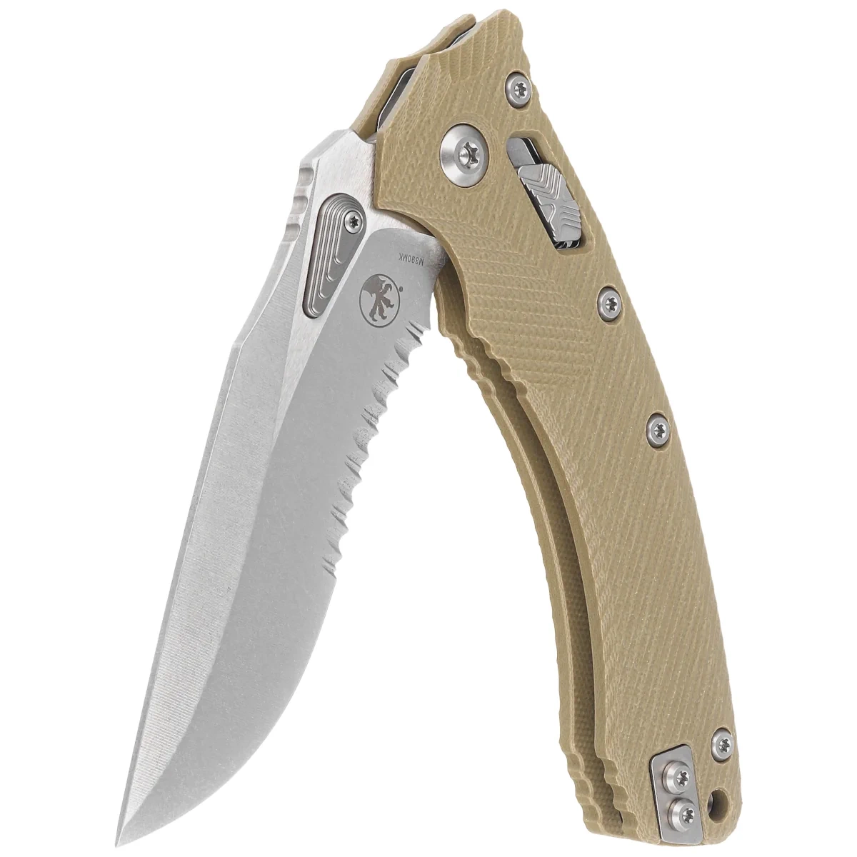 Rękojeść - wykonana z wytrzymałego kompozytu G10, dla lepszego uchwytu pokryta wyfrezowanymi liniami (Fluted). Szeroki suwak blokady z charakterystyczną dla firmy Microtech schodkową strukturą X. Obie okładziny zostały skręcone przy pomocy solidnego, backspacera. Dwustronny (prawa / lewa) tytanowy klips pozwala dyskretnie nosić nóż w pozycji tip-up. Nad klipsem lanyard hole, miejsce na linkę zabezpieczającą lub ozdobną.