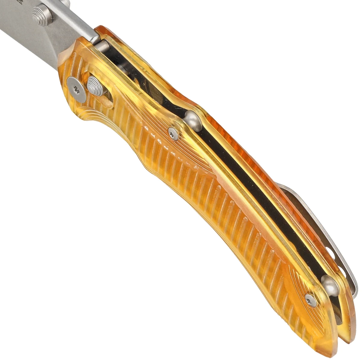 Rękojeść - okładziny z przezroczystego tworzywa Ultem™, praktycznie niezniszczalnego tworzywa niewrażliwego na warunki atmosferyczne, odpornego na chemikalia i uszkodzenia mechaniczne, pięknie frezowane przy pomocy obrabiarek CNC. Otwarta konstrukcja tzw. open-backed mocowana stalowymi tulejami dystansowymi redukuję wagę oraz ułatwia czyszczenie. Prosta, pewna konstrukcja daje pewność wieloletniego użytkowania. Klips jednopozycyjny (prawa), wykonany z tytanu, umożliwia przenoszenie noża w pozycji tip-up.