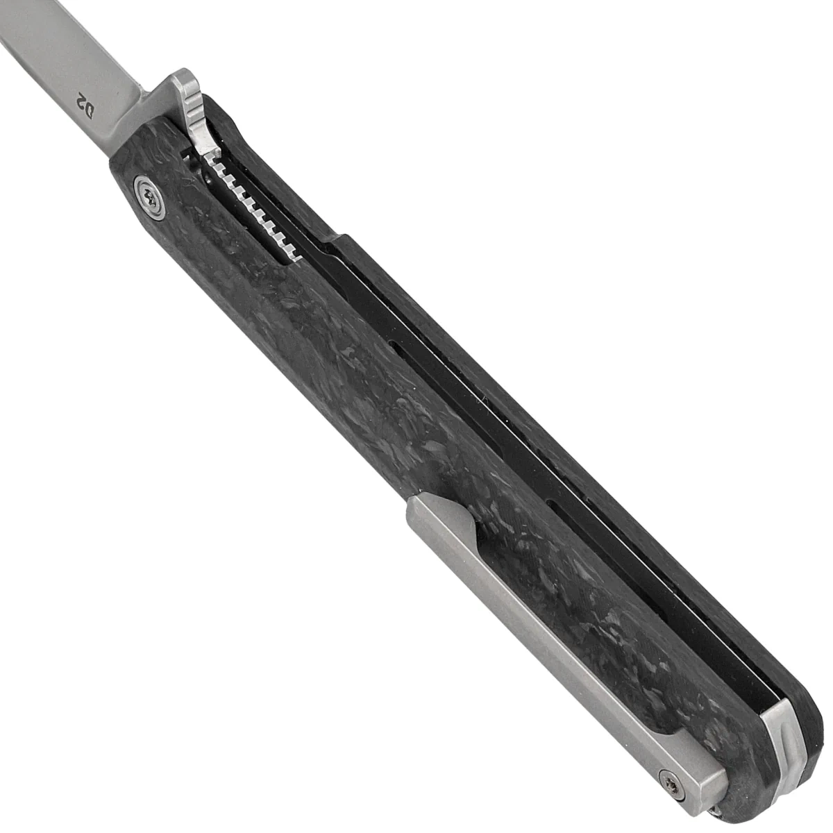 Rękojeść - wykonana z doskonałą precyzją z kompozytu Forged Carbon Fiber, praktycznie niezniszczalnego tworzywa, niewrażliwego na warunki atmosferyczne, odpornego na chemikalia i uszkodzenia mechaniczne. Faktura powierzchni oraz jimping na dole rękojeści powodują, że nóż nie ślizga się w dłoni podczas używania. Solidny backspacer do którego przymocowano okładziny gwarantuje sztywność i wytrzymałość całej konstrukcji. Ergonomiczny profil oraz jednopozycyjny (prawa) klips, umożliwiają dyskretne przenoszenie noża w kieszeni, w pozycji tip-up (czubkiem ostrza do góry). Nad klipsem lanyard hole, miejsce na linkę zabezpieczająca lub ozdobną.