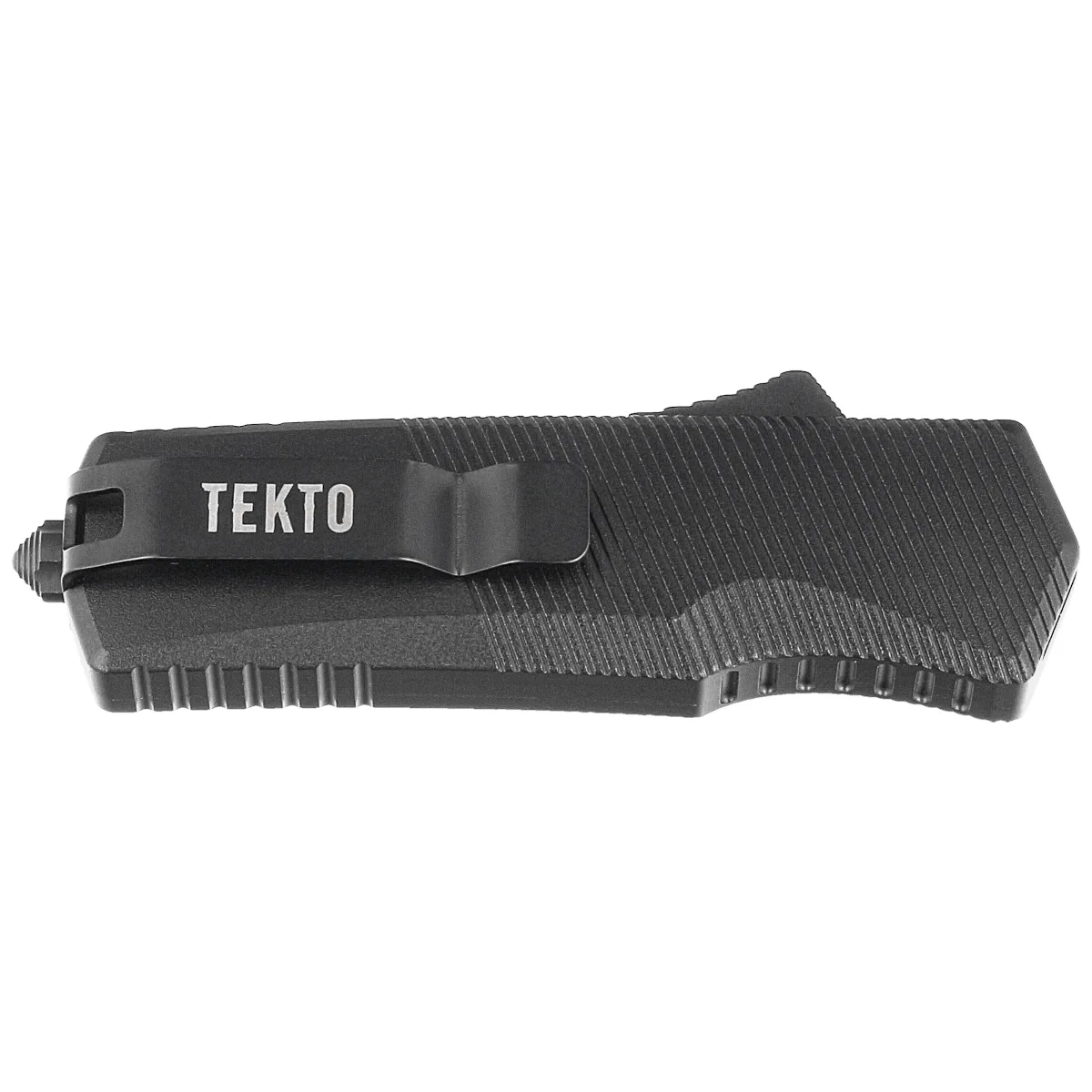 Rękojeść - wykonana z doskonałą precyzją w technologii 3D na frezarkach CNC, z aluminium 6061-T6. Moletowany fragment rękojeści powoduje, że nóż nie ślizga się w dłoni podczas używania. Na grzbiecie i dole rękojeści znajdują się nacięcia (jimping) dla pewniejszego chwytu. Smukły profil oraz frezowany dwupozycyjny (prawa/lewa) klips typu deep carry, umożliwiają dyskretne przenoszenie noża w kieszeni, w pozycji tip-down (czubkiem ostrza do dołu). Na klipsie znajduje się logo firmy Tekto. Rękojeść zakończono zbijakiem do bicia szyb.