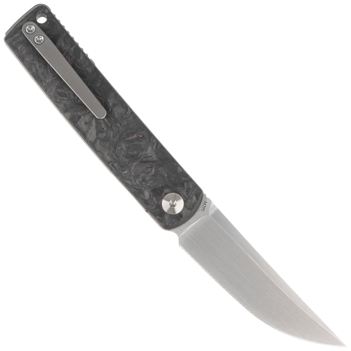 Rękojeść - szkielet z tytanu 6AL4V do którego przymocowano okładki z kompozytu Dark Matter Purple Fat Carbon. Konturowanie okładek eliminuje ostre krawędzie. Tylko nieliczne firmy są w stanie wykonać rękojeść z tak nieprawdopodobną dokładnością! Okładziny połączono ze sobą przy pomocy tytanowego backspacera pokrytego upper jimpingiem. Klips jednopozycyjny (prawa), z tytanu, umożliwia przenoszenie noża w pozycji tip-up.