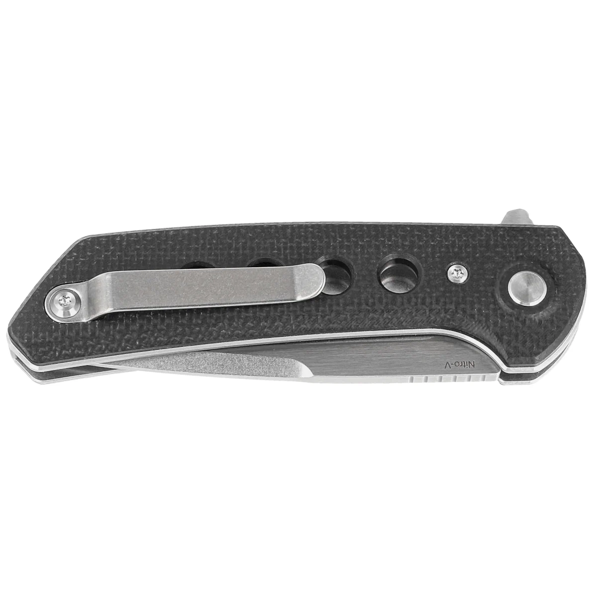 Rękojeść - okładziny z Micarty, praktycznie niezniszczalnego tworzywa niewrażliwego na warunki atmosferyczne, odpornego na chemikalia i uszkodzenia mechaniczne. Otwory w rękojeści inkrustowane kompozytem G10. Fazowane krawędzie okładek eliminują ostre ranty a charakterystyczne teksturowanie powierzchni poprawia pewność uchwytu. Masywny backspacer do którego przymocowano okładziny gwarantuje sztywność i wytrzymałość całej konstrukcji. Po lewej stronie suwak blokujący możliwość przypadkowego zwolnienia blokady. Dwupozycyjny (prawa/lewa) klips umożliwia przenoszenie noża w pozycji tip-up, czubkiem ostrza ku górze.