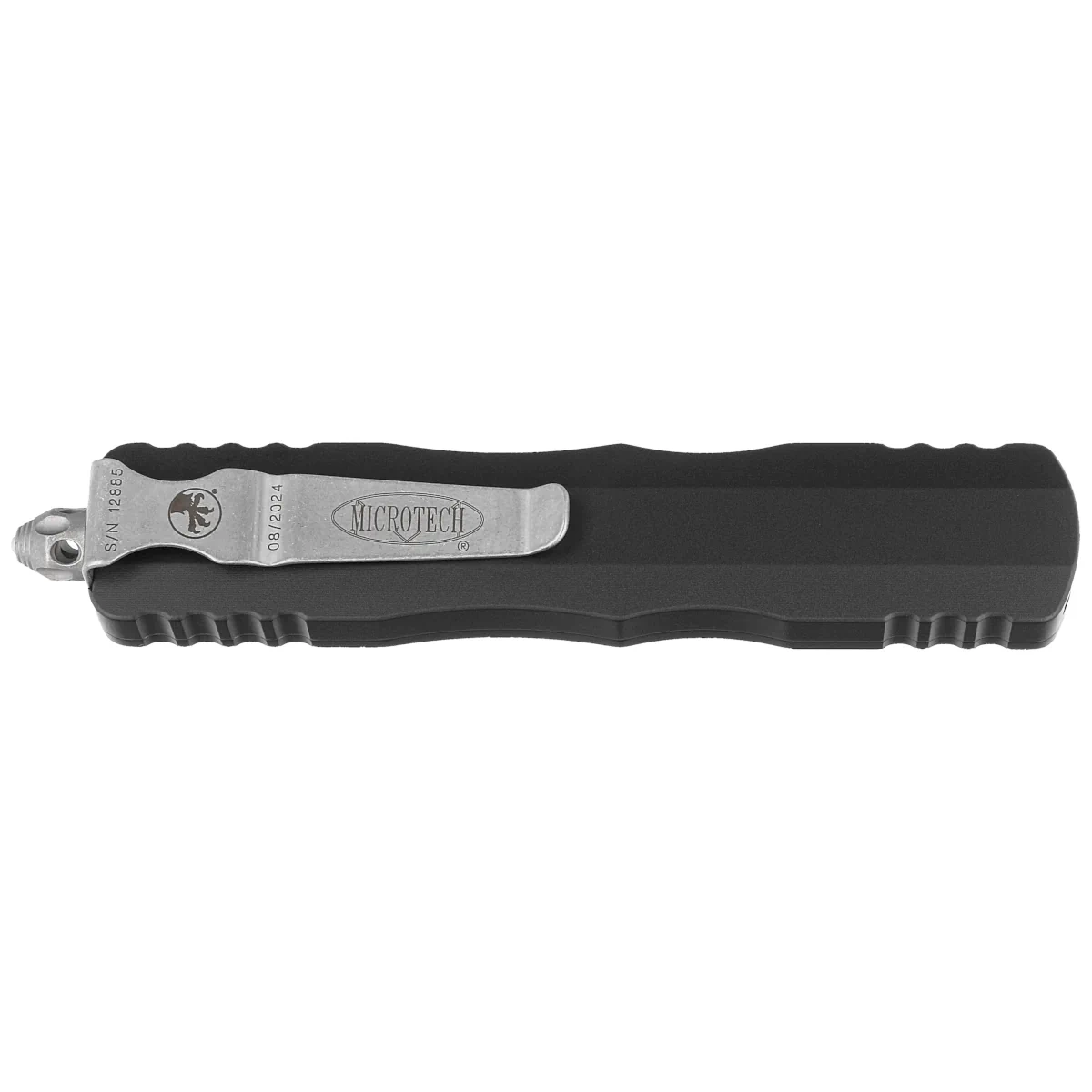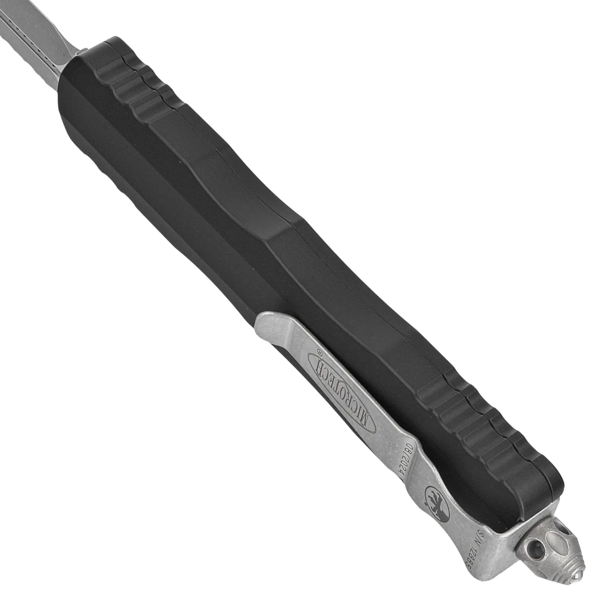 Rękojeść - wykonana z doskonałą precyzją w technologii 3D na frezarkach CNC, z anodyzowanego na czarno aluminium 6061-T6Faktura powierzchni rękojeści powoduje, że nóż nie ślizga się w dłoni podczas używania. Na grzbiecie i dole rękojeści znajdują się nacięcia (jimping) dla pewniejszego chwytu. Charakterystyczne jest umiejscowienie suwaka slidera, w zagłębieniu wyfrezowanym na boku rękojeści. Dzieki temu ręka układa się naturalniej przy otwieraniu i zamykaniu noża. Smukły profil oraz frezowany dwupozycyjny (prawa/lewa) masywny klips typu deep carry, umożliwiają dyskretne przenoszenie noża w kieszeni, w pozycji tip-down (czubkiem ostrza do dołu). Na klipsie znajduje się logo Microtech, numer seryjny i data produkcji. Rękojeść zakończono zbijakiem do bicia szyb, masywny stalowy trójkąt, w który wprasowano kulkę z węglika wolframu.