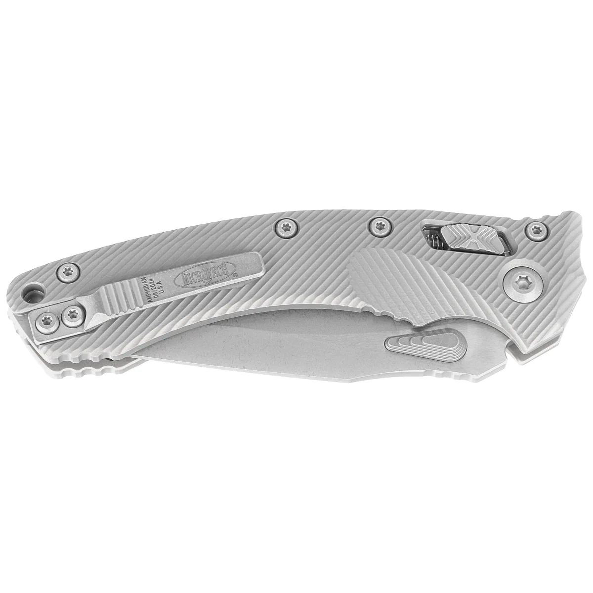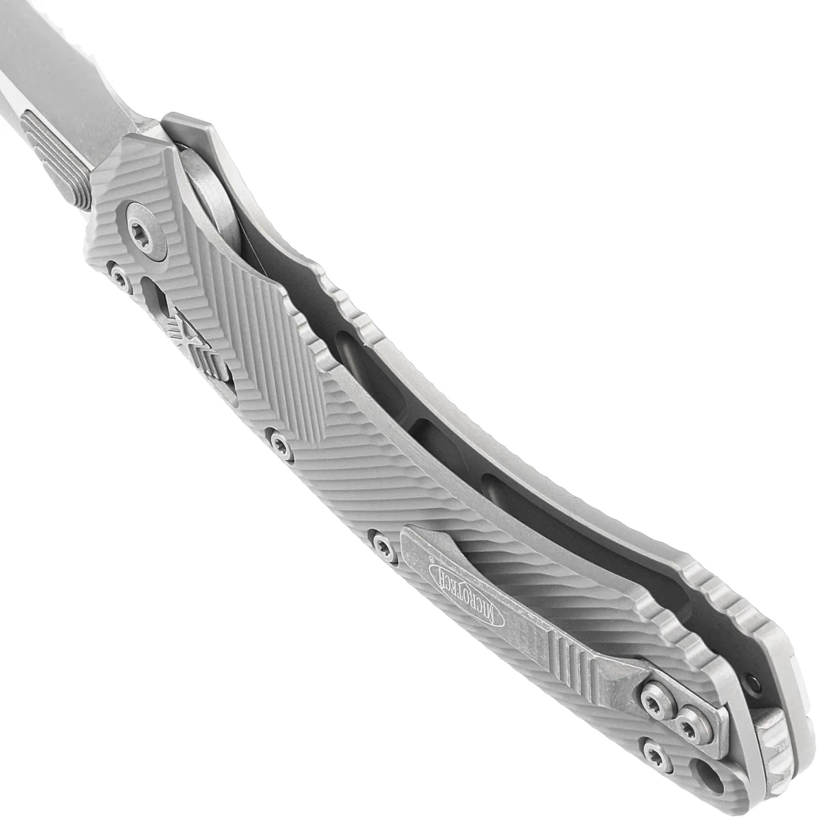 Rękojeść - wykonana z doskonałą precyzją w technologii 3D na frezarkach CNC, ze szczotkowanego i polerowanego aluminium 6061-T6, dla lepszego uchwytu pokryta wyfrezowanymi liniami (Fluted). Szeroki suwak blokady z charakterystyczną dla firmy Microtech schodkową strukturą X. Obie okładziny zostały skręcone przy pomocy solidnego, backspacera. Dwustronny (prawa / lewa) tytanowy klips pozwala dyskretnie nosić nóż w pozycji tip-up. Nad klipsem lanyard hole, miejsce na linkę zabezpieczającą lub ozdobną.