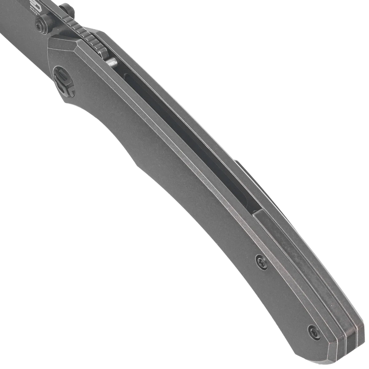 Rękojeść - to dwa kawałki litego, tytanu 6AL4V, przecieranego na krawędziach. Fazowane krawędzie okładek eliminują ostre krawędzie dla wygody, a podcięcie na palec (fore finger groove) poprawia pewność uchwytu. Tytanowy backspacer do którego przymocowano okładziny gwarantuje sztywność i wytrzymałość całej konstrukcji. Jednopozycyjny, prawostronny tytanowy klips umożliwia przenoszenie noża w pozycji tip-up, czubkiem ostrza ku górze.