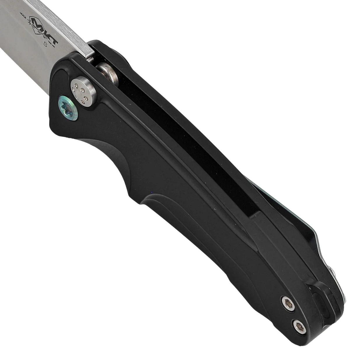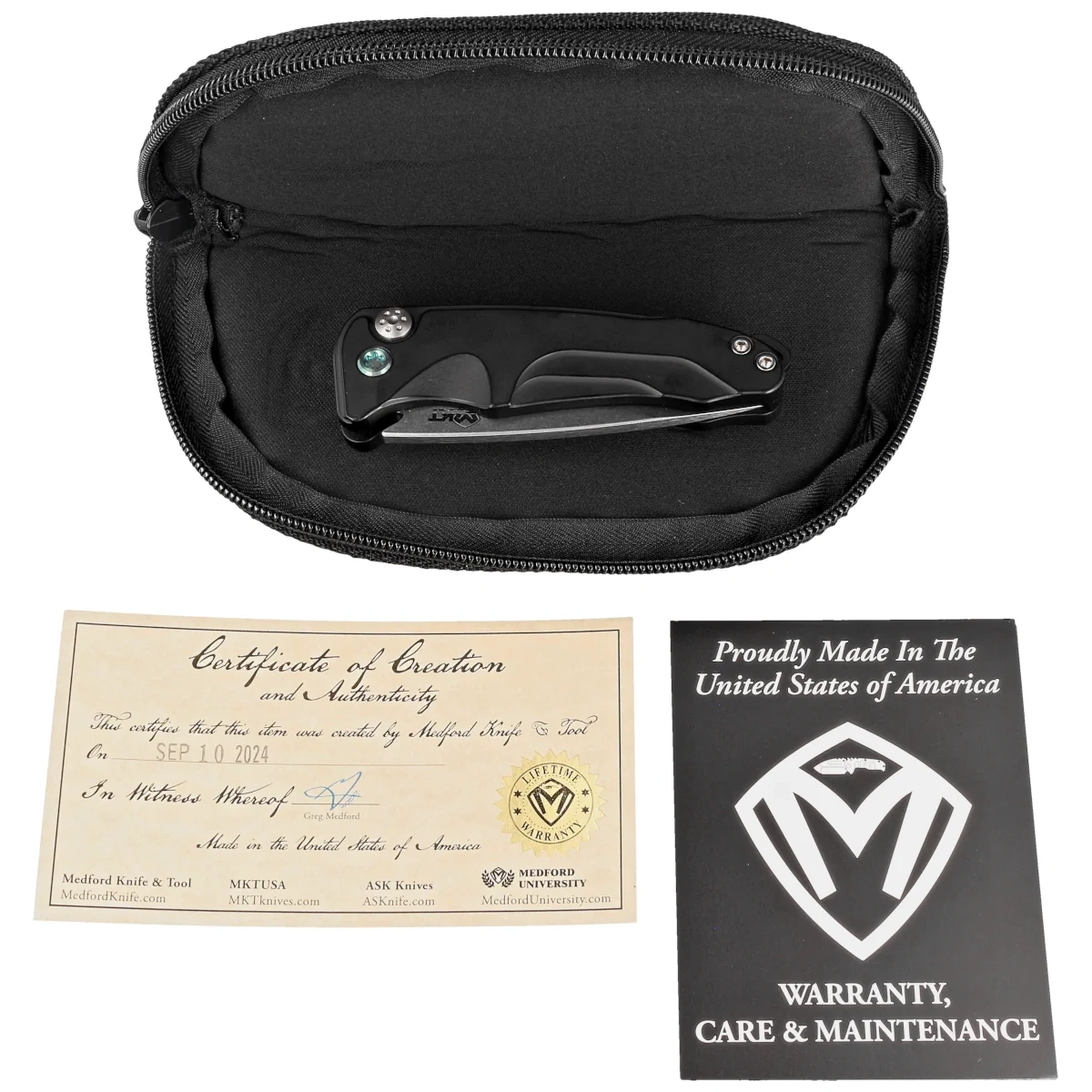 Rękojeść - dwa lite kawałki aluminium w kolorze czarnym, anodyzowane na twardo z lekkim polerowaniem idealnie pasują do wytrzymałej konstrukcji Medford Knives. Schodkowa faktura okładzin oraz rowki na palce, zapewniają doskonały chwyt podczas użytkowania. Backspacer kończy się owalnym otworem do przeplecenia linki zabezpieczającej lub ozdobnej. Kunsztowny przycisk blokady ostrza (button lock) ozdabia rękojeść i ułatwia trafienie dłonią np. w rękawicy. Całości dopełnia tytanowy klips typu deep carry. Klips i śruby (HW) anodyzowane na kolor zielony.