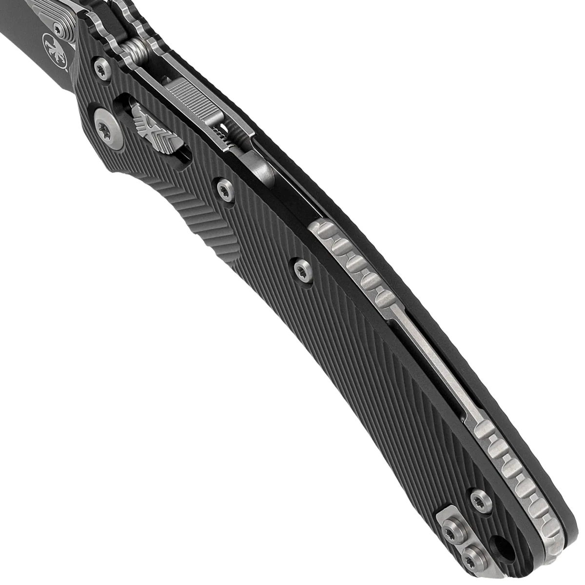 Rękojeść - wykonana z doskonałą precyzją w technologii 3D na frezarkach CNC, z pokrytego czarną powłoką Mil-Spec aluminium 6061-T6, dla lepszego uchwytu pokryta wyfrezowanymi liniami (Fluted). Szeroki suwak blokady z charakterystyczną dla firmy Microtech schodkową strukturą X. Obie okładziny zostały skręcone przy pomocy solidnego, backspacera. Dwustronny (prawa / lewa) tytanowy klips pozwala dyskretnie nosić nóż w pozycji tip-up. Nad klipsem lanyard hole, miejsce na linkę zabezpieczającą lub ozdobną.