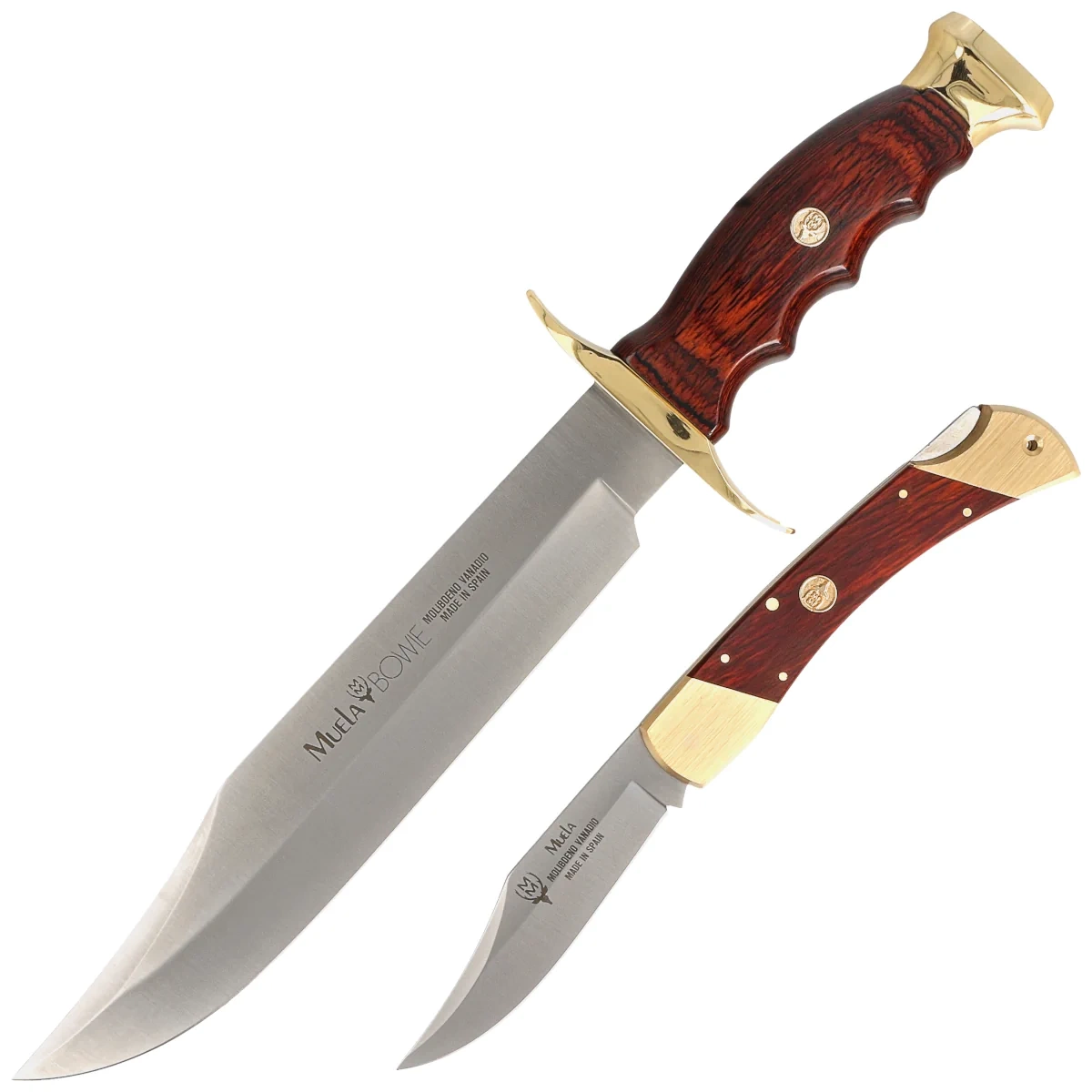 - BW-22N zestaw dwóch noży BW-22 i 10-M, duży nóż survivalowy i folder pomocniczy. Głownie z stali nierdzewnej X50CrMoV15. Okładziny rękojeści z laminatu drewna Pakka zakończone mosiężnymi głowicami. Pochwa z naturalnej brązowej skóry.