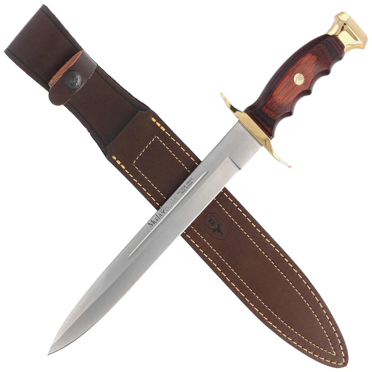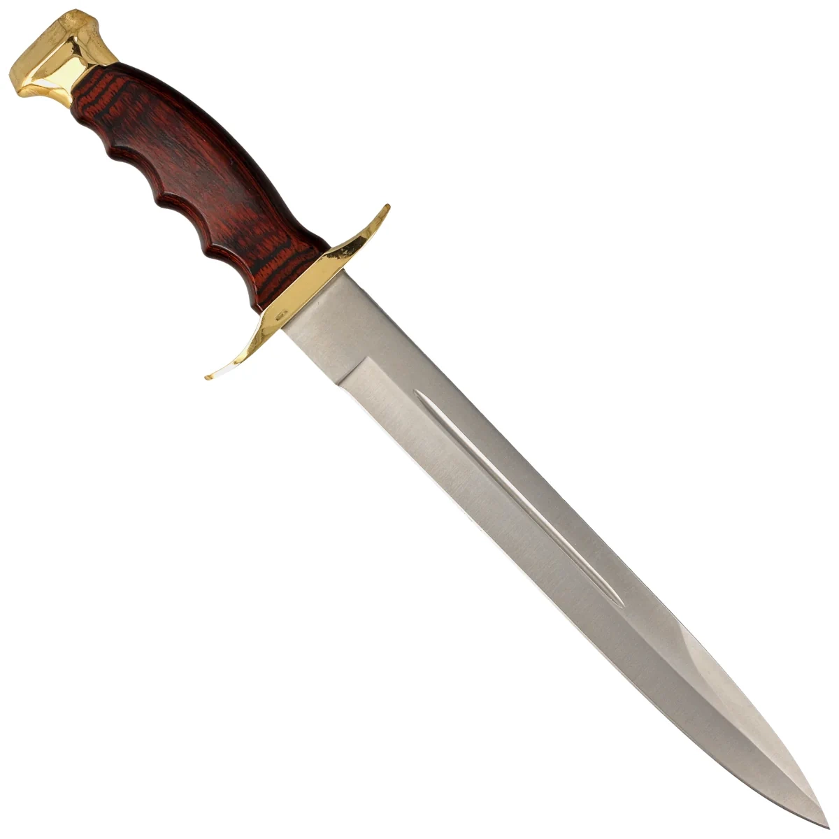 Głownia ostrze o profilu Spear Point wykończone eleganckim Satynowaniem. Mimo grubości, szlif wklęsły zapewnia doskonałe właściwości tnące połączone ze znakomitą wytrzymałością. Długie fałszywe ostrze zwiększa właściwości przebijające. Obustronna garda wykonana z mosiądzu, zabezpiecza palce przed ześlizgnięciem się na ostrze podczas pracy.