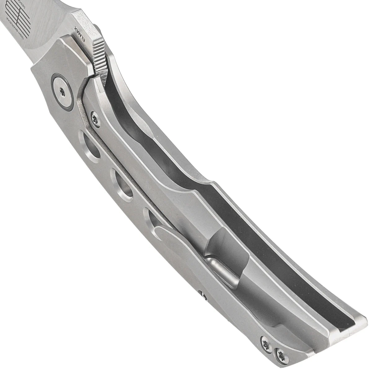 Rękojeść - z tytanu 6AL4V, dla polepszenia uchwytu szkiełkowane Bead Blasted. Fazowane krawędzie okładek eliminują ostre krawędzie. Tylko nieliczne firmy są w stanie wykonać rękojeść z tak nieprawdopodobną dokładnością! Seria otworów nie tylko odciąża fizycznie i wizualnie rękojeść, ale również polepsza pewność chwytu. Klips jednopozycyjny (prawa), z tytanu, umożliwia przenoszenie noża w pozycji tip-up. Nad klipsem lanyard hole, otwór umożliwiający przewleczenie linki zabezpieczającej lub ozdobnej.