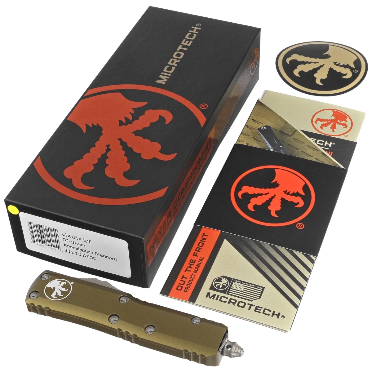 - UTX-85 S/E OD Green Aluminium, Apocalyptic to kompaktowy nóż automatyczny OTF z serii UTX-85. Zaprojektowany do zastosowań EDC, zachowuje wszystkie zalety większych modeli. Pracujący w trybie D/A, wyposażony w szybki mechanizm wysuwający ostrze.