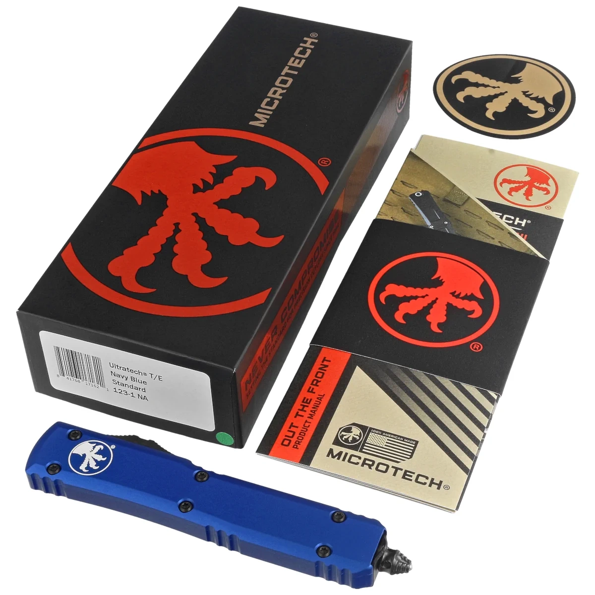 Ultratech T/E Navy Blue Aluminium, Satin to pełnowymiarowy nóż automatyczny OTF (Out The Front) z serii Ultratech. Wyposażony w piekielnie szybki mechanizm wysuwający ostre jak brzytwa ostrze tanto edge w użytkowym wykończeniu Stonewashed. Rękojeść z pokrytego twardą powłoką Mil-Spec aluminium. W 100% wyprodukowany i zmontowany w USA. Projekt Anthony'ego Marfione, knifemakera i właściciela Microtech Knives.