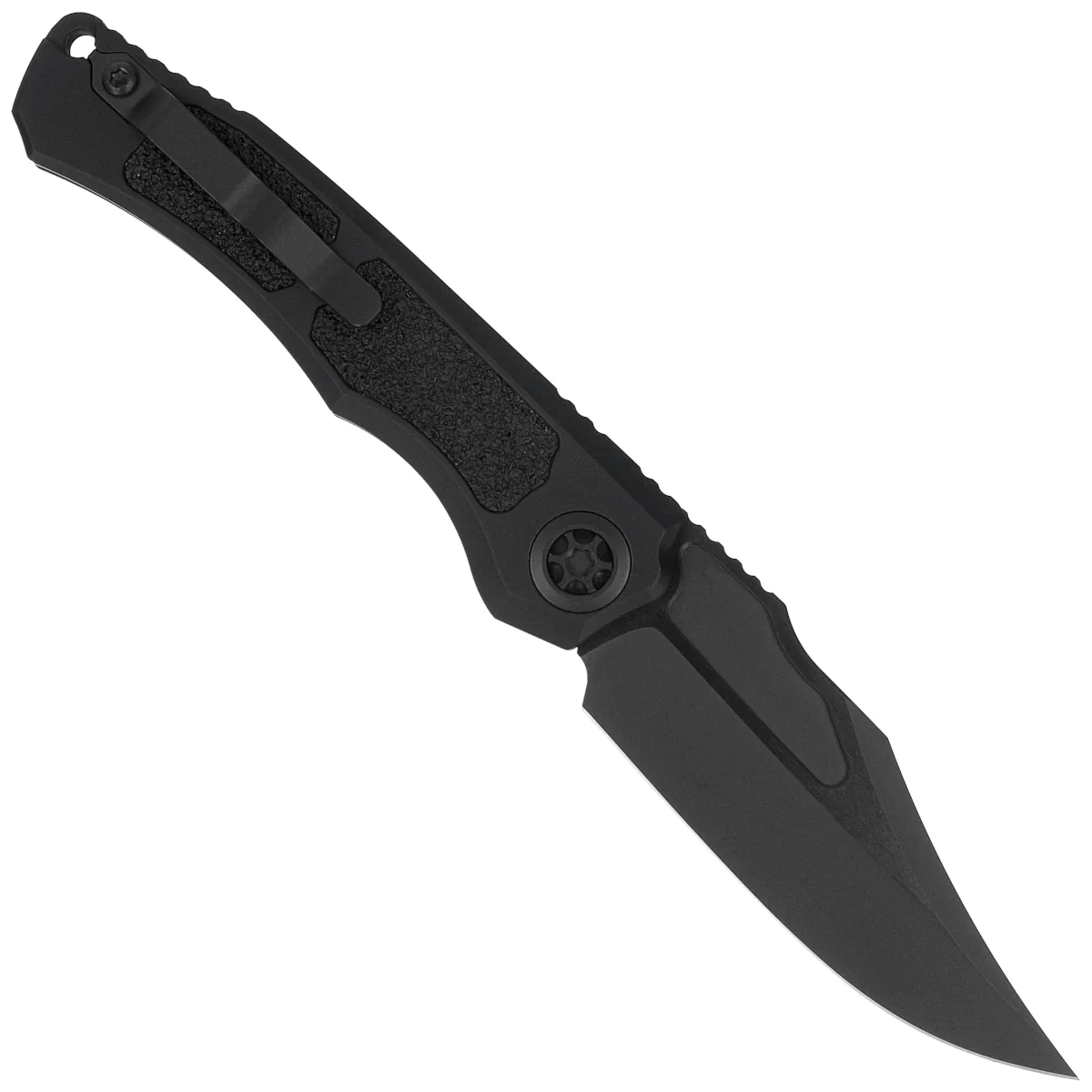 Głownia - szeroka, typu Clip Point, pokryta czarną powłoką DLC. Wydatny brzusiec wydłuża długość krawędzi tnącej w stosunku do długości klingi zbiegając się w kierunku ostrego jak igła czubka. Solidna grubość ostrza w połączeniu z wysokim płaskim szlifem (Flat Grind) daje doskonałe właściwości tnące połączone z wysoką wytrzymałością. Nóż otwieramy za pomocą przycisku z lewej strony rękojeści. Aby zachować pełną kontrolę nad ostrzem, na grzbiecie klingi wykonano upper jimping, karbowane oparcie pod kciuk. Całość blokowana jest doskonale znaną i sprawdzoną blokadą Button Lock.