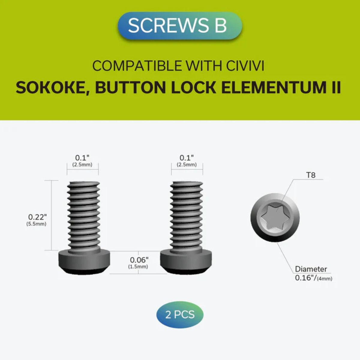 • Szary tytanowy klips kieszonkowy Civivi z dwoma kompletami szarych tytanowych śrub Trox T8 do noży WE i Civivi. Dwa różne zestawy śrub (śruby A i śruby B) pozwalają na mocowanie klipsa do wielu modeli folderów z odpowiednim rozstawem otworów mocujących.