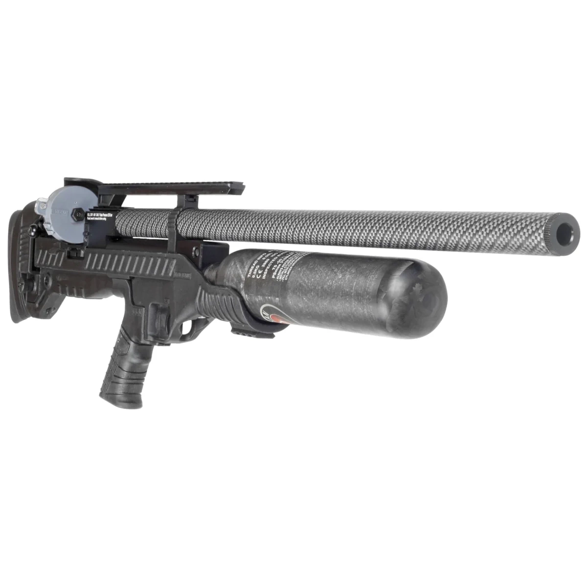 Zasilanie - stały zasobnik sprężonego powietrza z włókna węglowego o pojemności 580 cc (carbon fiber air tube bottle). W pełni naładowany kartusz pozwala na oddanie od 100 do 130 efektywnych strzałów w zależności od kalibru wiatrówki (dane dla wersji FAC*). Manometr pozwala na bieżąco kontrolować ciśnienie znajdujące się w zbiorniku, a tym samym stopnień jego naładowania. 130 bar minimalne ciśnienie robocze w kartuszu niezbędne do prawidłowego działania wiatrówki z systemem Full Auto i Semi Auto Action zalecane przez producenta. Ze względu na dużą pojemność ładowanie kartusza wyłącznie z butli technicznej lub nurkowej (300 bar).