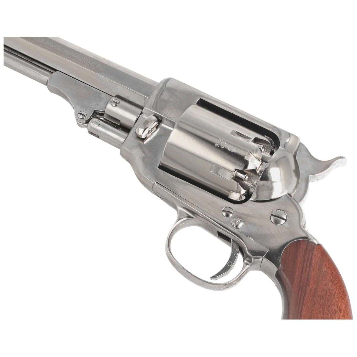 - 1862 Spiller & Burr sześciostrzałowy kapiszonowy rewolwer czarnoprochowy w kal. .36 to interesująca kombinacja dwóch legendarnych rewolwerów. Łączy w sobie najlepsze cechy Colta i Remingtona. Rama zamknięta, wykończenie niklowane, lufa 6.5".