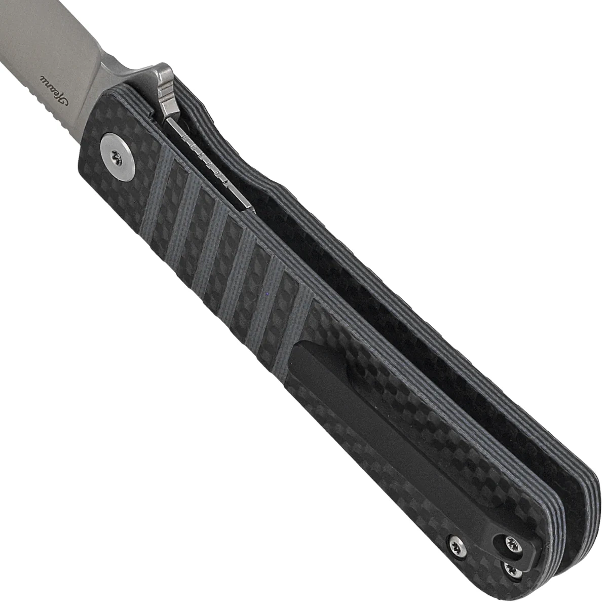 Titan Black Carbon Fiber/Blue G10, Stonewashed/Satin to folder EDC, będący owocem współpracy renomowanego projektanta Keanu Alfaro z marką Bestech. Precyzyjnie zaprojektowana klinga, wykonana z wytrzymałej stali CPM 154CM, zapewniającej nie tylko wysoką odporność, ale i długie trzymanie ostrości. Jej szeroki, uniwersalny profil idealnie nadaje się do precyzyjnych cięć i krojenia, czyniąc ją niezawodnym towarzyszem w codziennych wyzwaniach. Rękojeść z kompozytu G10 laminowanego włóknem węglowym cechuje się ergonomicznym kształtem a teksturowana powierzchnia zapewnia pewny chwyt, minimalizując ryzyko wyślizgnięcia, nawet w trudnych warunkach. Precyzja wykonania, widoczna w każdym detalu, gwarantuje niezrównaną wygodę użytkowania. Model Titan doskonale balansuje estetykę z praktycznością, oferując kompaktowy rozmiar i niezawodność, która spełni oczekiwania nawet najbardziej wymagających użytkowników.