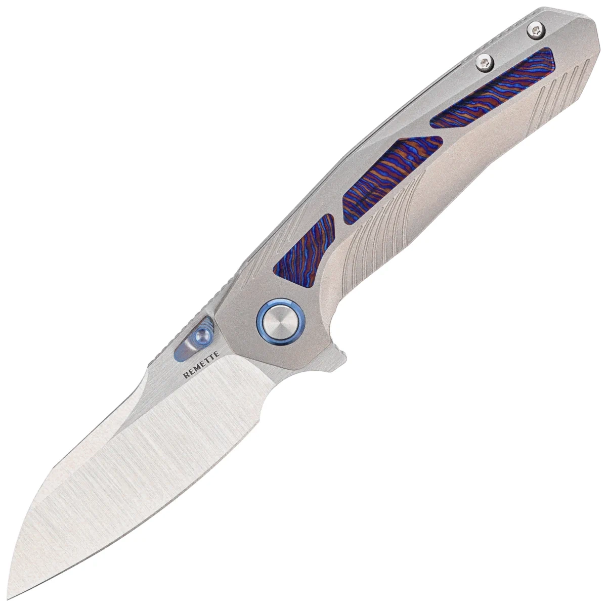 Rękojeść - to grube kawałki tytanu 6AL4V, konturowanie okładek eliminuje ostre krawędzie. Po obu stronach znajduje się inlay (wkładka) wykonana z Timascusa. Tylko nieliczne firmy są w stanie wykonać rękojeść z tak nieprawdopodobną dokładnością! Okładziny połączono ze sobą przy pomocy tytanowego backspacera. Prawostronny, jednopozycyjny klips deep carry, również z Timascusa pozwala przenosić dyskretnie nóż w kieszeni w pozycji tip-up (ostrzem do góry). Oś pivota jest ozdobiona tytanową obręczą (pivot collar cap).