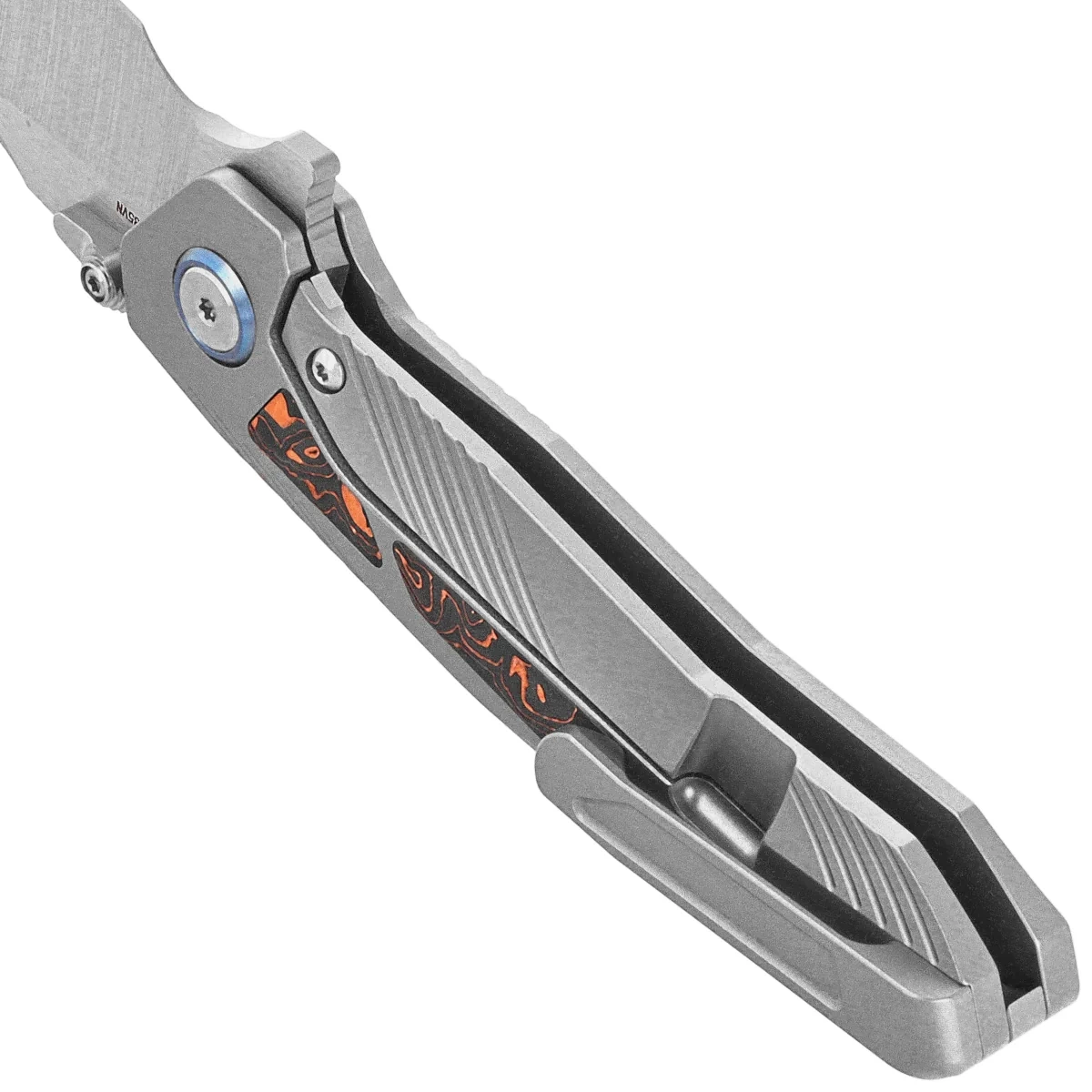 Rękojeść - to grube kawałki tytanu 6AL4V, konturowanie okładek eliminuje ostre krawędzie. Po obu stronach znajduje się inlay (wkładka) wykonana z kompozytu Copper Foil Carbon Fiber. Tylko nieliczne firmy są w stanie wykonać rękojeść z tak nieprawdopodobną dokładnością! Okładziny połączono ze sobą przy pomocy tytanowego backspacera. Prawostronny, jednopozycyjny tytanowy klips deep carry pozwala przenosić dyskretnie nóż w kieszeni w pozycji tip-up (ostrzem do góry). Oś pivota jest ozdobiona tytanową obręczą (pivot collar cap).