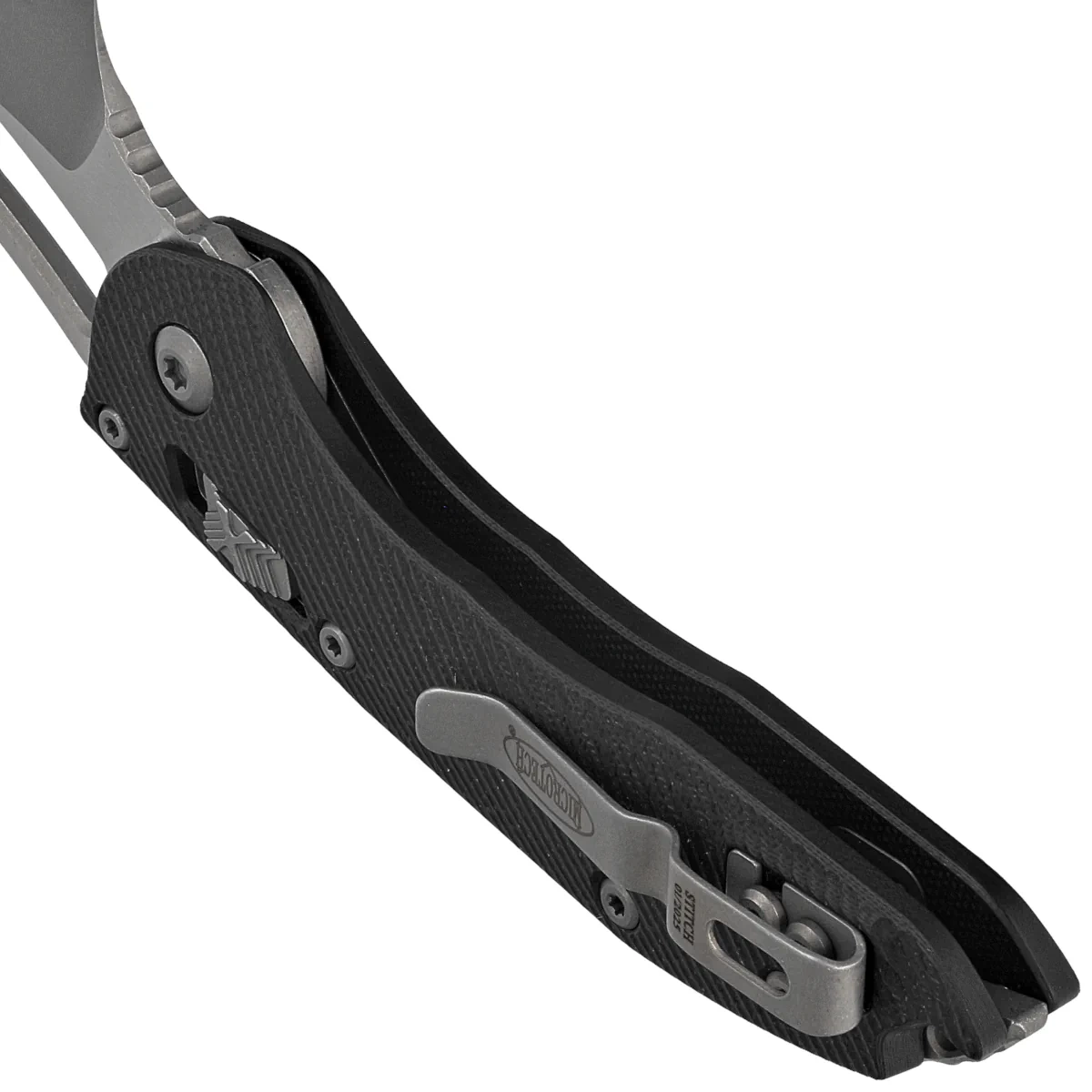 Rękojeść - wykonana na frezarkach CNC z doskonałą precyzją, z kompozytu G10, praktycznie niezniszczalnego tworzywa niewrażliwego na warunki atmosferyczne, odpornego na chemikalia i uszkodzenia mechaniczne, o głęboko frezowanej strukturze 3D Fluted. Szeroki suwak blokady z charakterystyczną dla firmy Microtech schodkową strukturą X. Obie okładziny zostały skręcone przy pomocy solidnego, aluminiowego backspacera. Dwustronny (prawa / lewa) klips pozwala dyskretnie nosić nóż w pozycji tip-up. Wystający fragment backspacera w którym znajduje się otwór na linkę, może również służyć za improwizowany zbijak do szkła.
