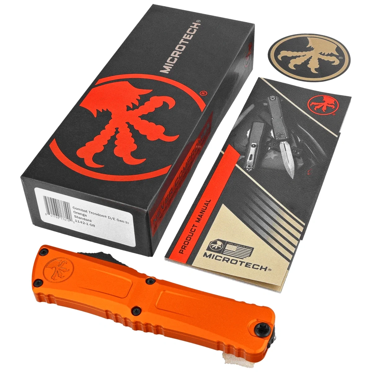 Combat Troodon Gen III D/E Orange Aluminum, Black ten największy z noży automatycznych, to szczyt precyzyjnej inżynierii i taktycznej sprawności w dziedzinie noży OTF (Out The Front). Zbudowany z myślą o szerokim spektrum zastosowań użytkowych, może pochwalić się większym o 25% rozmiarem w porównaniu do flagowego Troodona. Precyzyjnie wykonany, wyposażony w wyrafinowany i piekielnie szybki mechanizm wysuwający ostre jak brzytwa ostrze. W 100% wyprodukowany i zmontowany w USA. Projekt Anthony'ego Marfione, knifemakera i właściciela Microtech Knives.