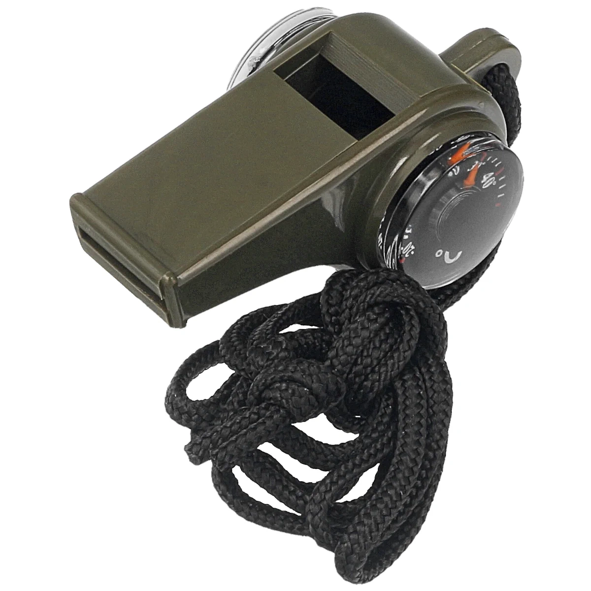 Wielofunkcyjny gwizdek survivalowy marki Mil-Tec, wykonany z lekkiego i wytrzymałego tworzywa sztucznego w kolorze Olive. Wyposażony w wbudowany kompas oraz termometr, co czyni go idealnym narzędziem dla miłośników outdooru, turystów, harcerzy oraz instruktorów sportowych. Dzięki dołączonej linki można go wygodnie nosić na szyi.