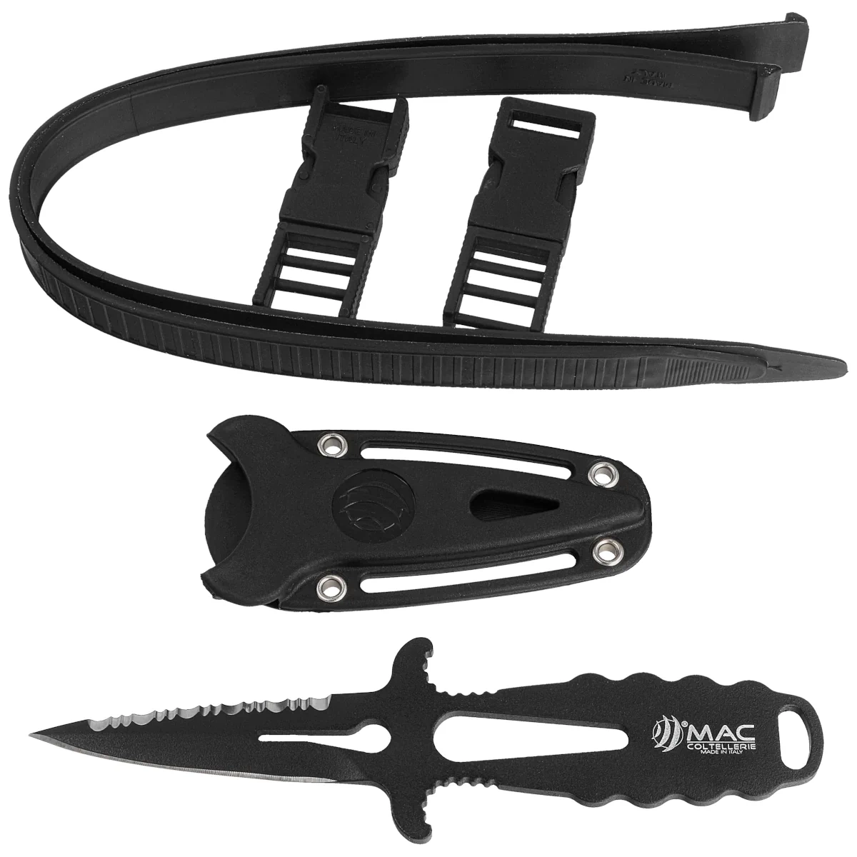 - Apnea 9 BE Black Skeleton kompaktowy nóż nurkowy z ostrzem do cięcia lin/taśm, otworem do szekli i narzędziem do bełtów z kusz podwodnych. Wykonany ze stali nierdzewnej W 1.4060 z dodatkiem azotu. W zestawie wielopozycyjna pochwa z tworzywa PP.