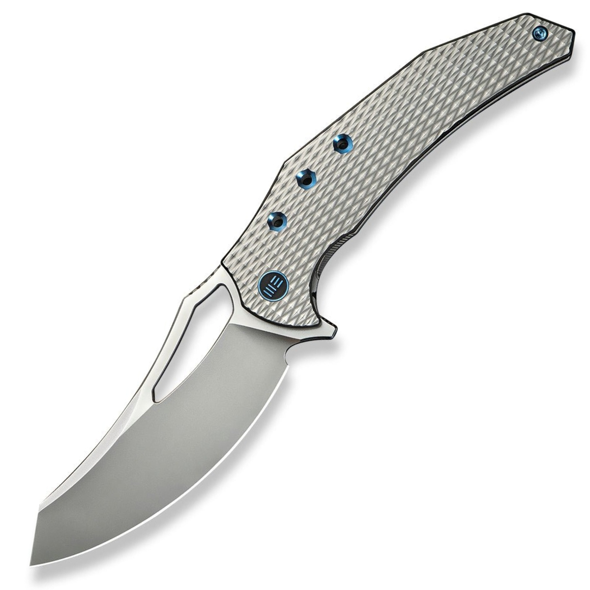 Rękojeść - z tytanu 6AL4V, fazowane krawędzie okładek eliminują ostre krawędzie. W całości pokryta teksturą w kształcie diamentu, zwiększającą pewność chwytu. Otwarta konstrukcja tzw. open-backed mocowana tytanowymi tulejami dystansowymi redukuję wagę oraz ułatwia czyszczenie. Oś pivota zdobi stylizowane logo marki WE Knife. Głębokie podcięcie na palec (fore finger groove) poprawia pewność uchwytu. Jednopozycyjny (prawa) tytanowy klips deep carry pozwala przenosić dyskretnie nóż w kieszeni w pozycji tip-up (czubkiem ostrza do góry).