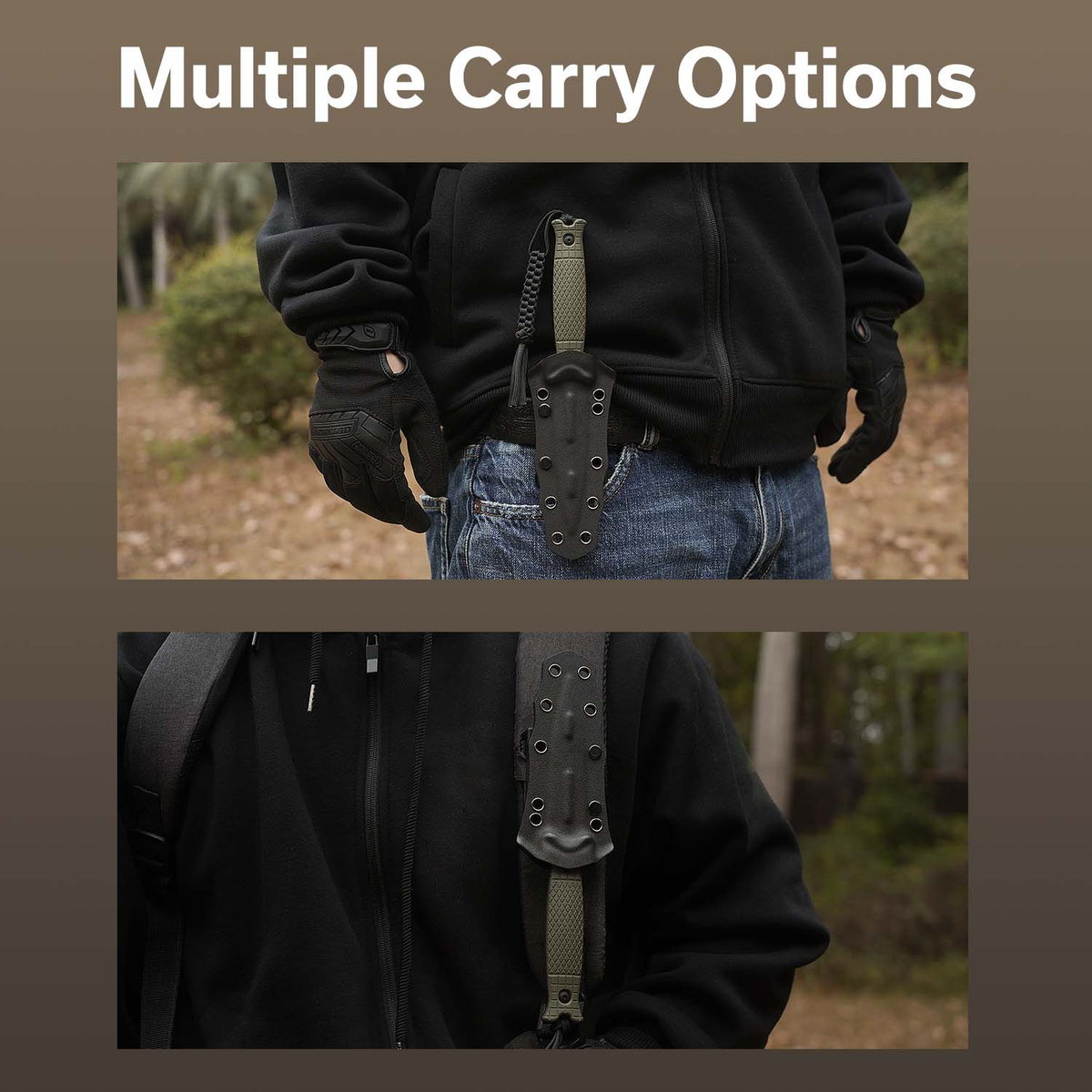 Pochwa - wykonana z czarnego kydexu bezpiecznie utrzymująca nóż na miejscu. Wyposażona w mocowanie T-Clip zaprojektowane przez Boba Terzuolę, umożliwia wielopozycyjne (prawe/lewe, pionowe/poziome) przenoszenie pochwy z stałym ostrzem na pasie lub oporządzeniu. T-Clip działający podobnie jak Tek-Lok pozwala na dopasowanie sposobu noszenia do indywidualnych preferencji użytkownika. Wzmocniony włóknem szklanym T-Clip, zawiera zestaw śrub wraz z parą plastikowych podkładek.