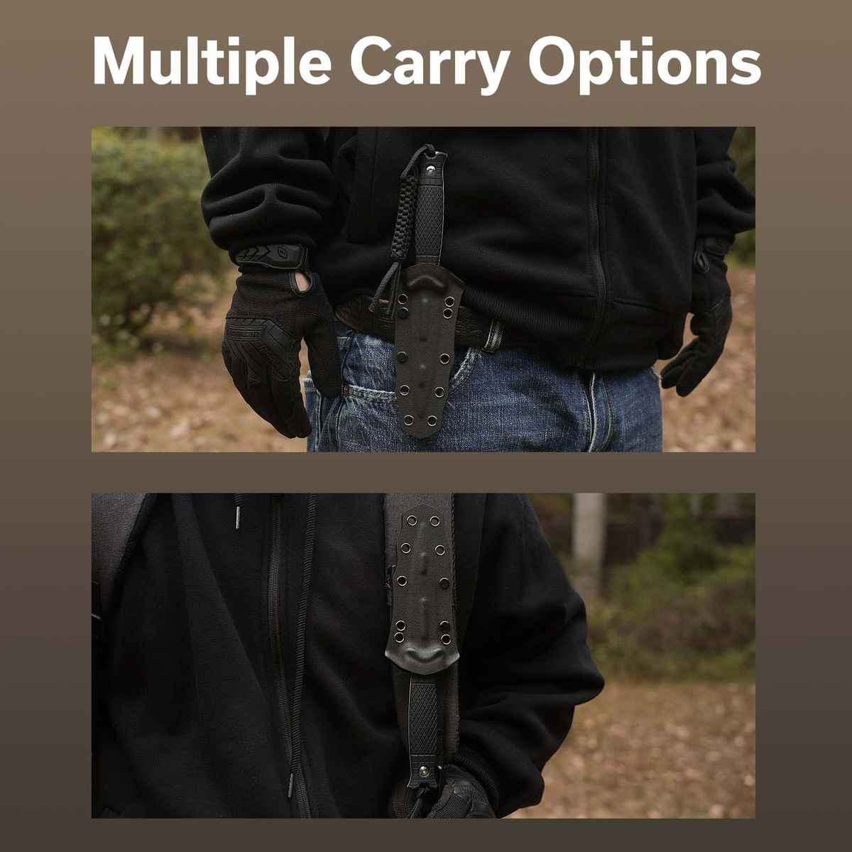 Pochwa - wykonana z czarnego kydexu bezpiecznie utrzymująca nóż na miejscu. Wyposażona w mocowanie T-Clip zaprojektowane przez Boba Terzuolę, umożliwia wielopozycyjne (prawe/lewe, pionowe/poziome) przenoszenie pochwy z stałym ostrzem na pasie lub oporządzeniu. T-Clip działający podobnie jak Tek-Lok pozwala na dopasowanie sposobu noszenia do indywidualnych preferencji użytkownika. Wzmocniony włóknem szklanym T-Clip, zawiera zestaw śrub wraz z parą plastikowych podkładek.