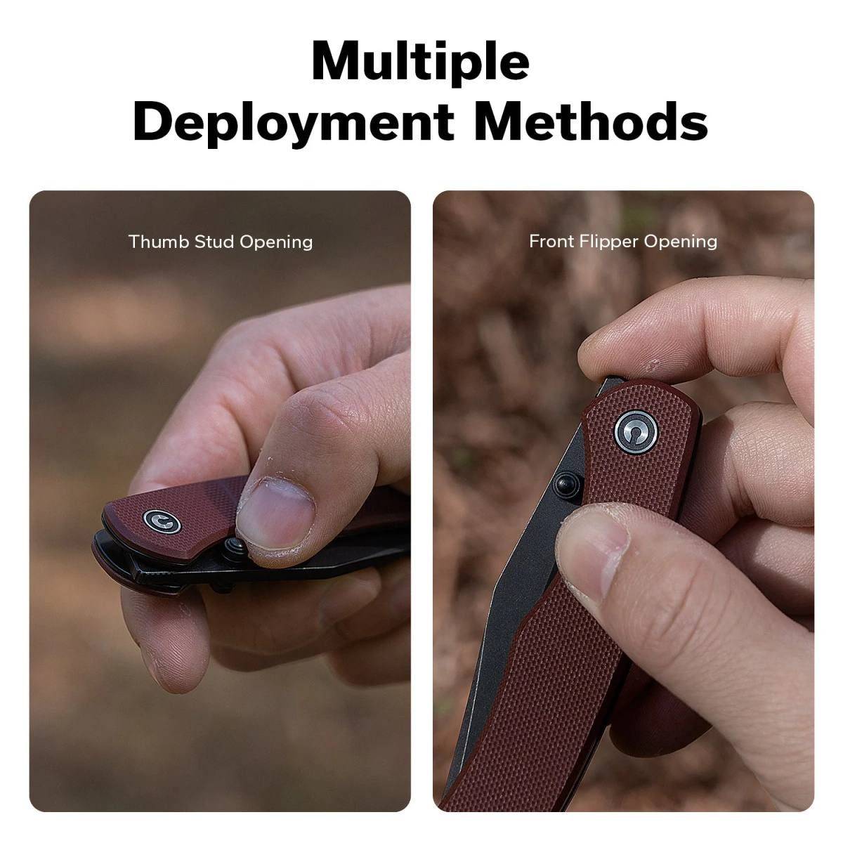 Rękojeść - szorstkie okładziny z kompozytu G10, praktycznie niezniszczalnego tworzywa niewrażliwego na warunki atmosferyczne, odpornego na chemikalia i uszkodzenia mechaniczne, które zostały przykręcone do stalowych linersów. Otwarta konstrukcja tzw. open-backed mocowana stalowymi tulejami dystansowymi redukuję wagę oraz ułatwia czyszczenie. Prosta, pewna konstrukcja daje pewność wieloletniego użytkowania. Klips typu deep carry, dwupozycyjny (prawo/lewo), umożliwia przenoszenie noża w pozycji tip-up (czubkiem do góry). Oś pivota zdobi stylizowane logo marki Civivi.