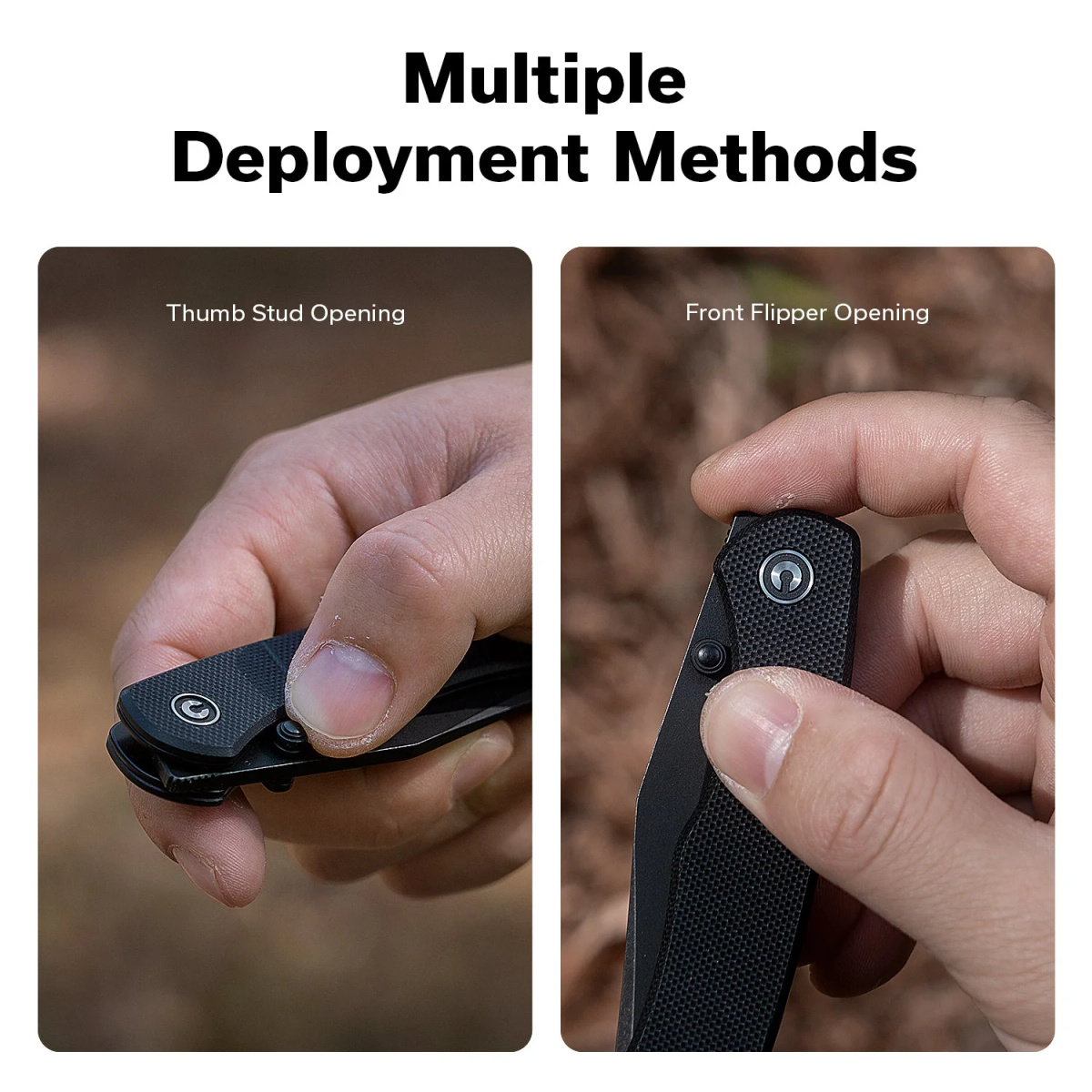 Rękojeść - szorstkie okładziny z kompozytu G10, praktycznie niezniszczalnego tworzywa niewrażliwego na warunki atmosferyczne, odpornego na chemikalia i uszkodzenia mechaniczne, które zostały przykręcone do stalowych linersów. Otwarta konstrukcja tzw. open-backed mocowana stalowymi tulejami dystansowymi redukuję wagę oraz ułatwia czyszczenie. Prosta, pewna konstrukcja daje pewność wieloletniego użytkowania. Klips typu deep carry, dwupozycyjny (prawo/lewo), umożliwia przenoszenie noża w pozycji tip-up (czubkiem do góry). Oś pivota zdobi stylizowane logo marki Civivi.
