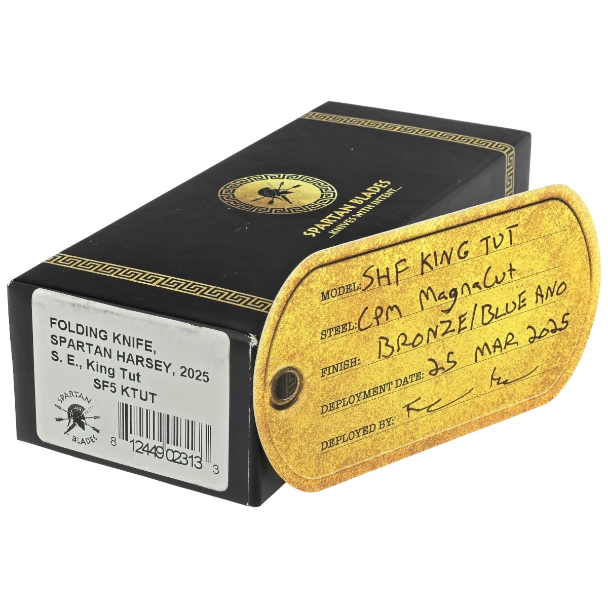 Spartan Harsey Folder Special Edition "King Tut" Bronze/Blue Ano Titanium, Blue HW, Stonewashed. "Spartan Harsey Folder" lub "SHFuznawany jest za arcydzieło wśród noży taktycznych. Zaprojektowany przez legendę knifemakingu, Billa Harseya, został wyprodukowany w limitowanej serii. Zdobywca nagrody American Made Knife of The Year 2016 na targach nożowych Blade Show w Atlancie.
