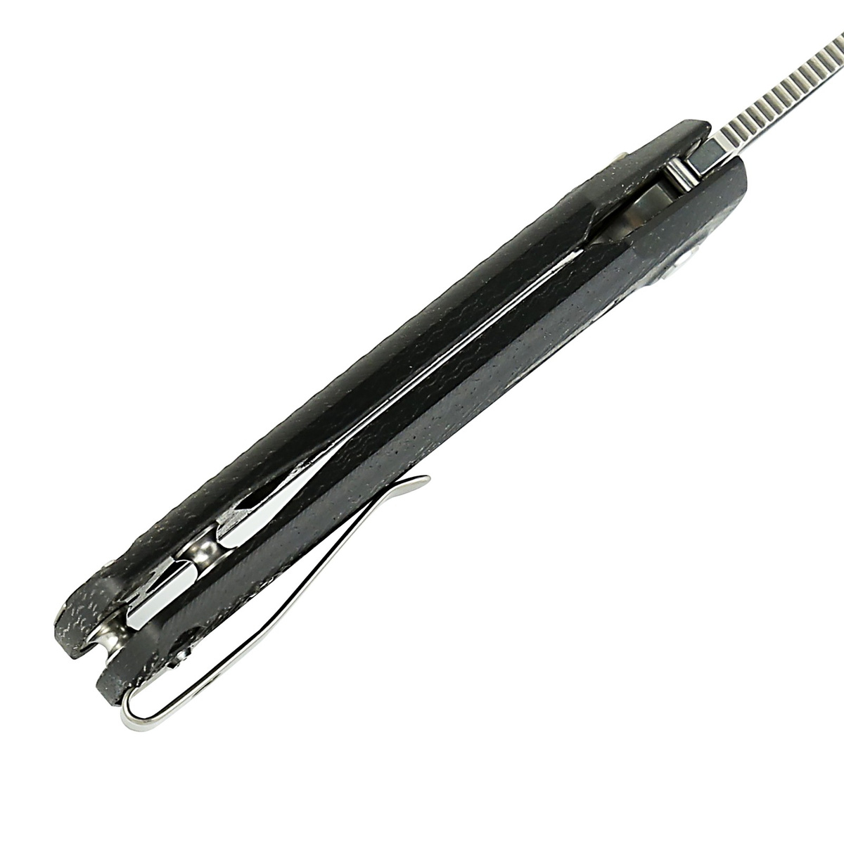 Rękojeść - okładziny z Micarty, praktycznie niezniszczalnego tworzywa niewrażliwego na warunki atmosferyczne, odpornego na chemikalia i uszkodzenia mechaniczne. Fazowane krawędzie okładek eliminują ostre ranty a charakterystyczne teksturowanie powierzchni poprawia pewność uchwytu. Otwarta konstrukcja tzw. open-backed bez typowego backspacera, mocowana do siebie tulejami dystansowymi ułatwia czyszczenie. Prosta, lecz solidna konstrukcja gwarantuje wieloletnie użytkowanie. Po lewej stronie suwak blokujący możliwość przypadkowego zwolnienia blokady. Dwupozycyjny (prawa/lewa) klips umożliwia przenoszenie noża w pozycji tip-up, czubkiem ostrza ku górze.
