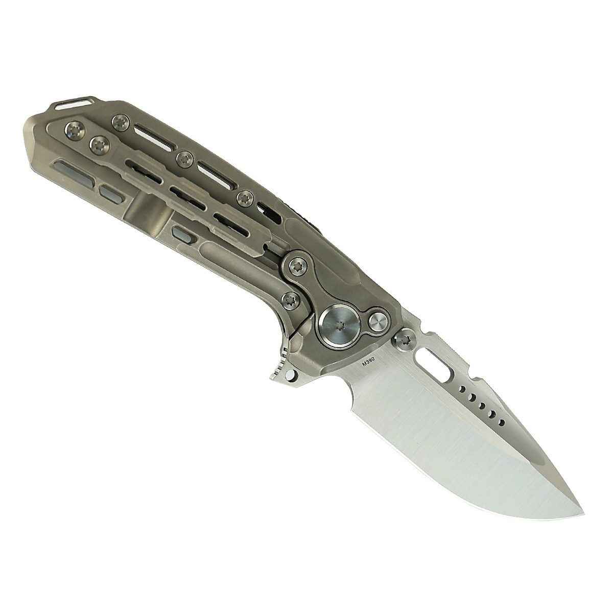 Rękojeść - z litego tytanu 6AL4V, perfekcyjnie wyfrezowana na obrabiarkach numerycznych CNC. Konturowanie okładek eliminuje ostre krawędzie, a ażurowana powierzchnia poprawia pewność chwytu. Tylko nieliczne firmy są w stanie wykonać rękojeść z tak nieprawdopodobną dokładnością! Okładziny połączono ze sobą przy pomocy tytanowego backspaceraKlips jednopozycyjny (prawa), z tytanu, umożliwia przenoszenie noża w pozycji tip-up. Na grzbiecie suwak zwalniania dodatkowej blokady w postaci dwóch stalowych walców umieszczonych nad osią pivota. Blokada działa również, gdy nóż jest zamknięty, zapobiegając przypadkowemu otwarciu. Wystający fragment backspacera może być używany jako improwizowany zbijak do szyb, posiada również otwór na linkę zabezpieczająca lub ozdobną.