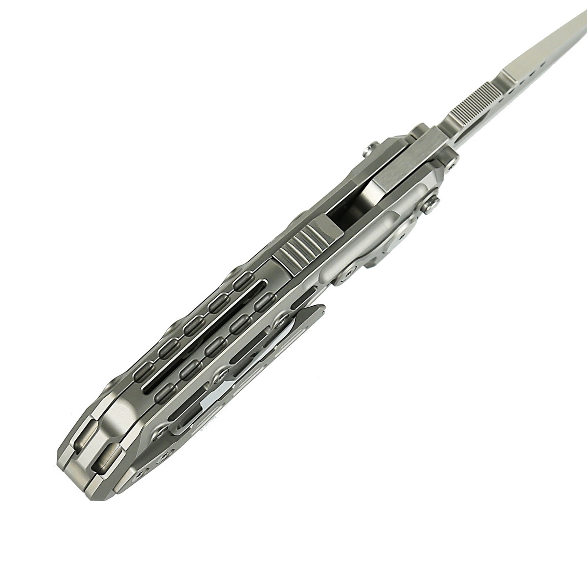 Rękojeść - z litego tytanu 6AL4V, perfekcyjnie wyfrezowana na obrabiarkach numerycznych CNC. Konturowanie okładek eliminuje ostre krawędzie, a ażurowana powierzchnia poprawia pewność chwytu. Tylko nieliczne firmy są w stanie wykonać rękojeść z tak nieprawdopodobną dokładnością! Okładziny połączono ze sobą przy pomocy tytanowego backspacera. Klips jednopozycyjny (prawa), z tytanu, umożliwia przenoszenie noża w pozycji tip-up. Na grzbiecie suwak zwalniania dodatkowej blokady w postaci dwóch stalowych walców umieszczonych nad osią pivota. Blokada działa również, gdy nóż jest zamknięty, zapobiegając przypadkowemu otwarciu. Wystający fragment backspacera może być używany jako improwizowany zbijak do szyb, posiada również otwór na linkę zabezpieczająca lub ozdobną.
