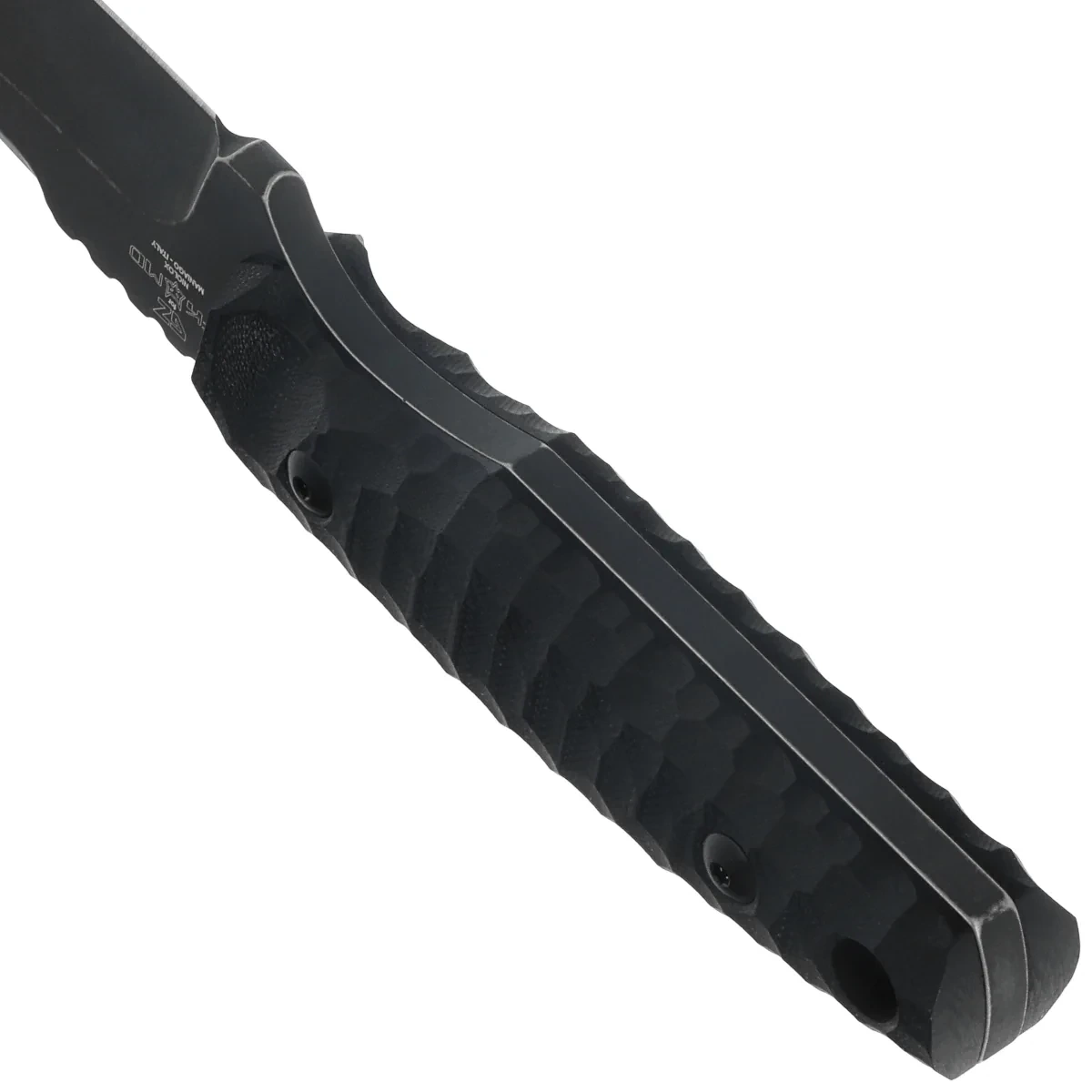 Rękojeść - wykonano z wytrzymałego laminatu G10, odpornego na wilgoć, chemikalia i uszkodzenia mechaniczne. Materiał ten doskonale sprawdza się w nożach przeznaczonych do zastosowań taktycznych, zapewniając trwałość i pewny chwyt. Ergonomiczne profilowanie i agresywna faktura powierzchni umożliwiają stabilną obsługę w rękawicach, w deszczu czy w warunkach silnego zabrudzenia. Okładziny przykręcono do pełnego trzpienia (full tang), co zwiększa sztywność i wytrzymałość konstrukcji. Na zakończeniu rękojeści znajduje się otwór na linkę, pozwalający na zabezpieczenie noża lub jego personalizację. W komplecie znajduje się pochwa z Kydexu, odporna na warunki atmosferyczne i uszkodzenia, umożliwiająca montaż w pionie, poziomie lub na systemie MOLLE. To rękojeść zaprojektowana dla tych, którzy oczekują bezpieczeństwa, trwałości i komfortu – bez kompromisów.