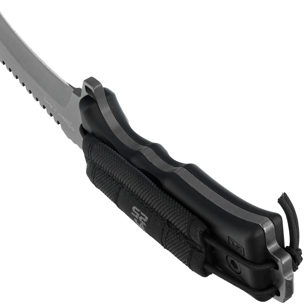 Rękojeść - z tworzywa SFL została zaprojektowana z myślą o pełnej kontroli nad maczetą, nawet w niesprzyjających warunkach atmosferycznych. Teksturowana powierzchnia oraz wyprofilowane zagłębienia na palce poprawiają przyczepność, zmniejszając ryzyko wyślizgnięcia się narzędzia podczas dynamicznych ruchów. Całość jest odporna na uderzenia, skrajne temperatury i wilgoć. Otwór na końcu chwytu umożliwia mocowanie linki zabezpieczającej. W zestawie znajduje się pochwa z nylonu balistycznego z mocowaniem MOLLE, umożliwiająca przenoszenie maczety przy pasie, plecaku lub innym oporządzeniu. To rozwiązanie spełnia oczekiwania użytkowników poszukujących cięższego narzędzia o wysokiej skuteczności operacyjnej i trwałości.