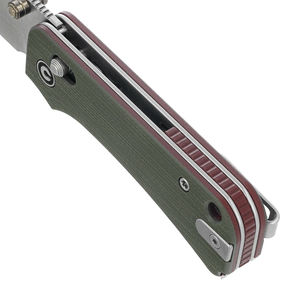 Rękojeść - dwa wytrzymałe kawałki kompozytu G10. Całość przykręcona do solidnego backspacera, również wykonanego z G10. Oś pivota zdobi stylizowane logo marki Civivi. Dwupozycyjny lewo / prawostronny metalowy klips deep carry pozwala przenosić dyskretnie nóż w kieszeni w pozycji tip-up (czubkiem ostrza do góry). W rękojeści ukryto dwa przydatne narzędzia, stalową pęsetę i wykałaczkę. Z tyłu rękojeści lanyard hole, otwór na linkę.
