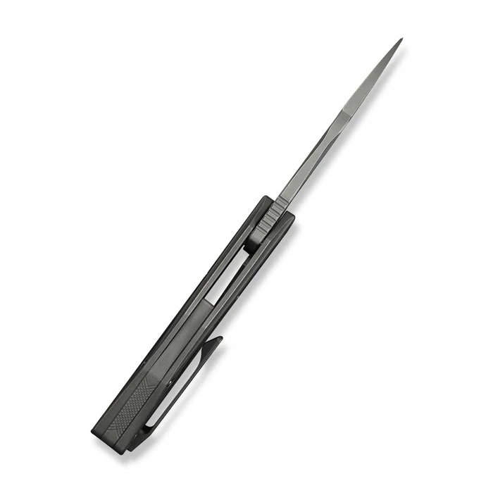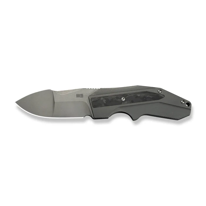 Rękojeść - wykonano z frezowanego tytanu 6Al-4V, zapewniającego wysoką sztywność, odporność mechaniczną i lekkość. Główne panele wzbogacono o wkładki z unikalnego kompozytu Marble Carbon Fiber, oferującego trójwymiarowy efekt optyczny i podwyższoną przyczepność powierzchni w każdych warunkach. Delikatne profilowanie krawędzi oraz ergonomiczne podcięcia pod palce wspierają komfort i kontrolę pracy nawet przy dłuższym użytkowaniu w środowisku terenowym lub EDC. Konstrukcję wzmacnia precyzyjnie spasowany backspacer oraz klips typu deep-carry tip-up, umożliwiający dyskretne i stabilne przenoszenie noża w kieszeni. Całość utrzymana została w eleganckiej, minimalistycznej estetyce, łączącej nowoczesną inżynierię z najwyższą kulturą wykonania typową dla projektów Cecchiniego w linii premium WeKnife.