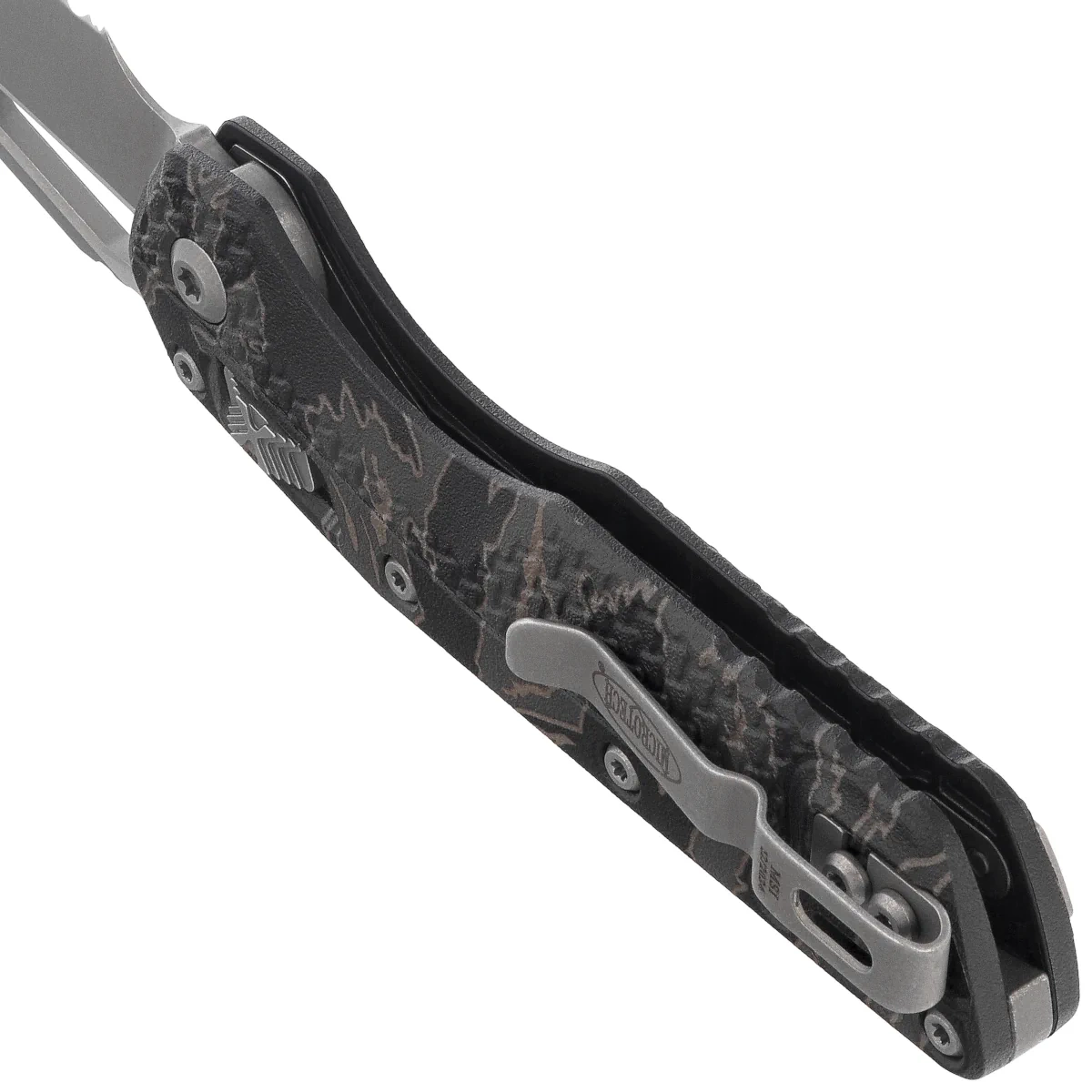 MSI S/E Ram-Lok Tiger Stripe Camo Tri-Grip Polymer, Apocalyptic P/S nóż składany, łączący w sobie siłę, wytrzymałość i elegancję. Jego ostrze wykonane jest z doskonałej stali M390MK, która jest wynikiem współpracy dwóch renomowanych firm - Microtech i Böhler. Stal ta jest znana ze swojej wyjątkowej wytrzymałości i długiego trzymania ostrości, dzięki czemu ten nóż nie boi się żadnych wyzwań. Intuicyjna blokada RAM-Lok zapewnia bezpieczeństwo podczas użytkowania. Ta innowacyjna blokada jest łatwa w obsłudze i zapewnia łatwość obsługi osobom prawo jak i leworęcznym. Rękojeść noża wykonana z polimeru, wytrzymała i ergonomiczna. Jej kształt został zaprojektowany tak, aby idealnie pasować do dłoni, co zapewnia komfort nawet podczas długotrwałego użytkowania. Ten nóż to nie tylko narzędzie, ale także dzieło sztuki użytkowej. Jego projektant, Anthony Marfione, założyciel i właściciel firmy Microtech, zadbał o każdy szczegół. Od eleganckiego czarnego wykończenia po satynowe detale, ten nóż jest zarówno piękny jak i praktyczny. Bez względu na to, czy szukasz niezawodnego narzędzia, czy eleganckiego dodatku, folder MSI (Microtech Standard Issue) spełni Twoje oczekiwania.
