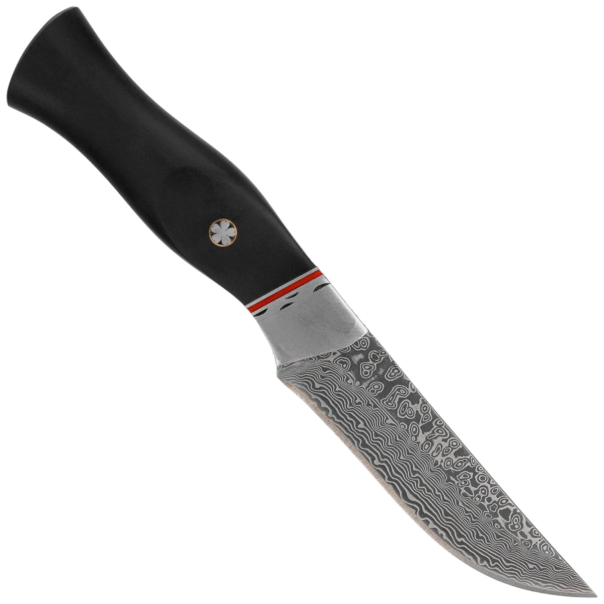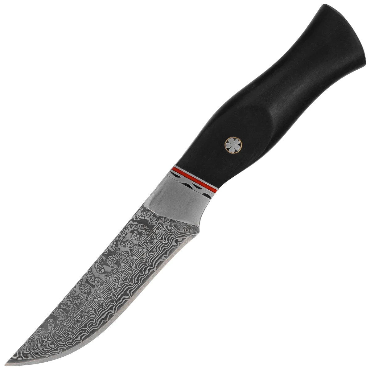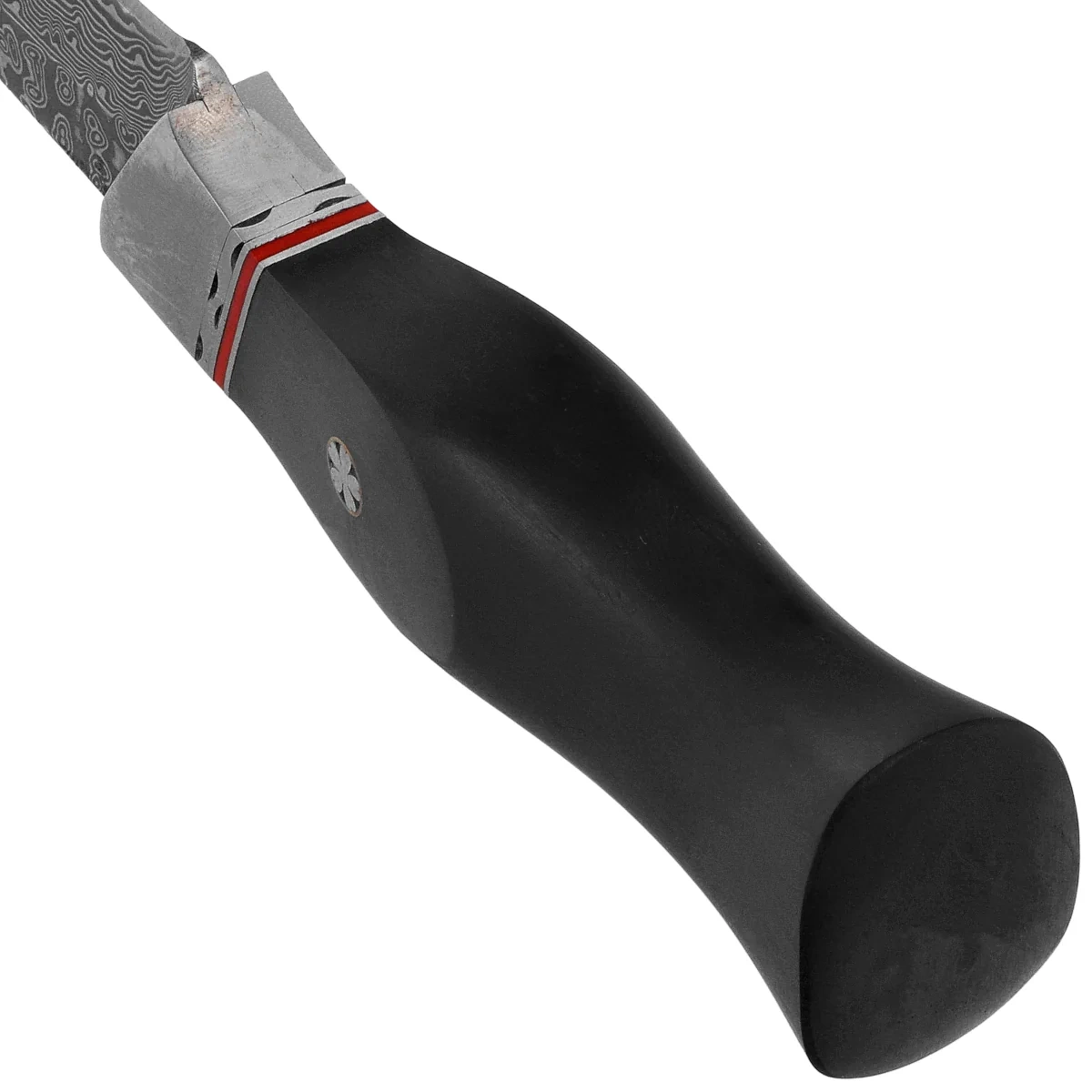 Głownia - o profilu clip point została wykonana z 73-warstwowej stali Damascus, która łączy wysoką odporność na naprężenia z elastycznością i trwałością. Charakterystyczny wzór powstały w procesie skuwania warstw tworzy niepowtarzalną linię wizualną, będąc jednocześnie wynikiem technologii wykorzystywanej od setek lat w mistrzowskich kuźniach. Płaski szlif poprawia parametry cięcia, umożliwiając precyzyjną pracę w terenie, a całość została wyważona tak, by wspierać komfort użytkowania zarówno w pracy z drewnem, jak i w zadaniach myśliwskich.