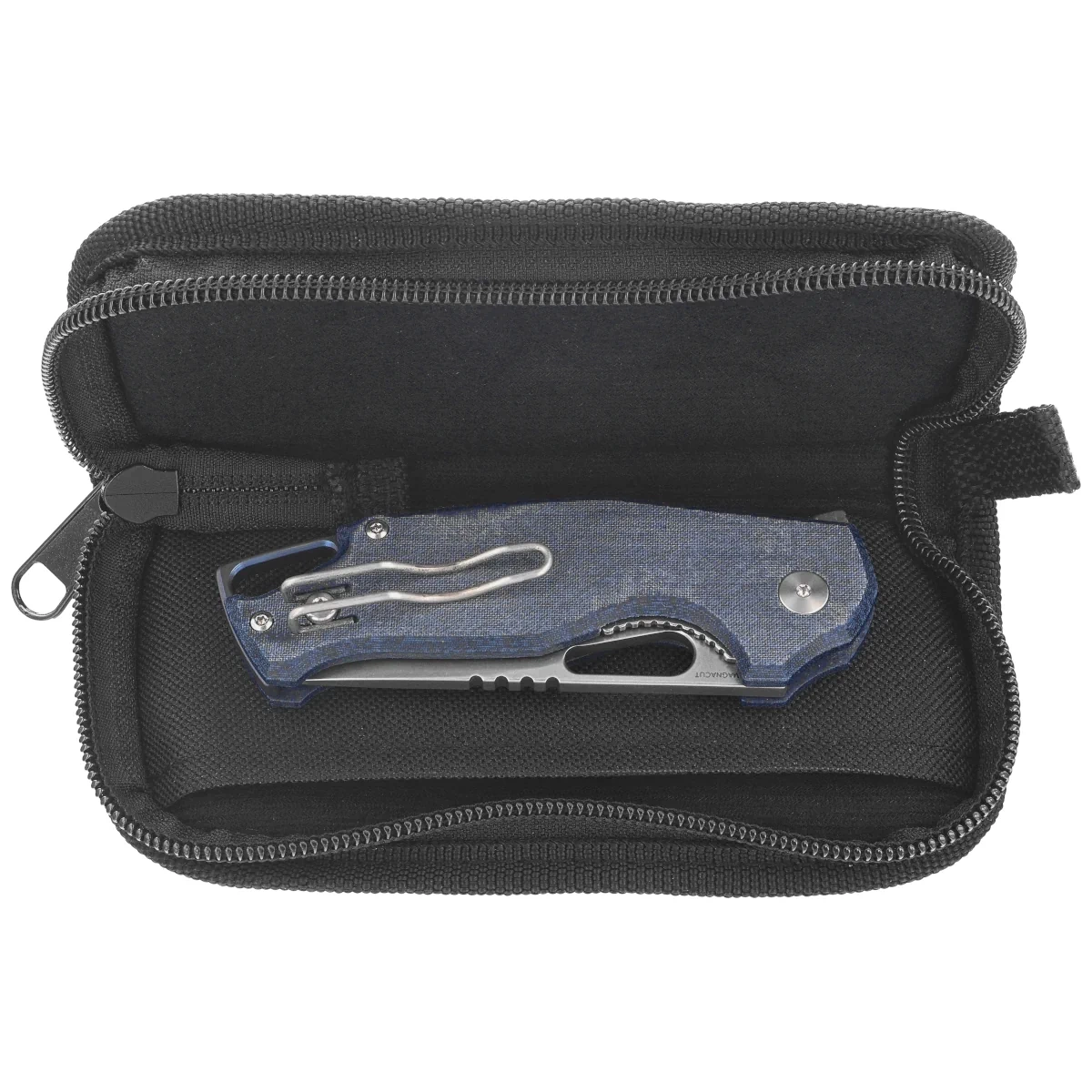 Futerał - nóż zapakowano w zapinane zamkiem miękkie nylonowe etui z logo marki. Służy do bezpiecznego przechowywania i transportowania foldera.