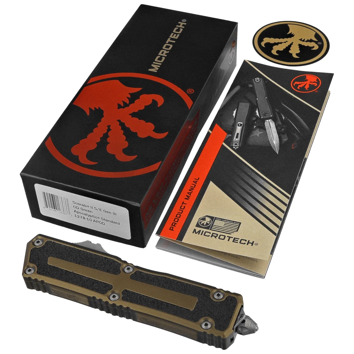 Scarab II Gen III S/E OD Green Aluminium/3M, Apocalyptic to szczyt doskonałości w dziedzinie automatycznych noży taktycznych, czerpiący inspirację z oryginalnego projektu Microtech Ultratech. Zbudowany, aby wytrzymać najtrudniejsze warunki, nowy Scarab II jest najlepszym wyborem do intensywnego użytkowania. Zachowując cechy stylistyczne swojego poprzednika, wyznacza nowy standard dla technologii OTF (Out The Front).