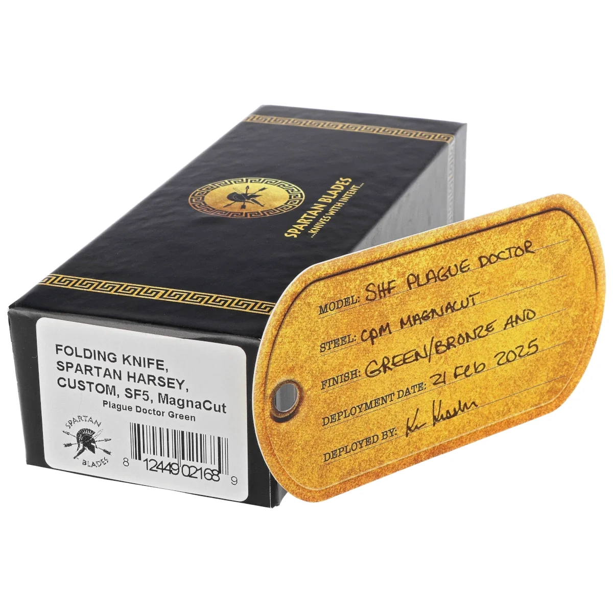 Spartan Harsey Folder Special Edition "Plague Doctor" Green Titanium, Bronze HW, Satin. "Spartan Harsey Folder" lub "SHF" uznawany jest za arcydzieło wśród noży taktycznych. Zaprojektowany przez legendę knifemakingu, Billa Harseya, został wyprodukowany w limitowanej serii. Zdobywca nagrody American Made Knife of The Year 2016 na targach nożowych Blade Show w Atlancie.