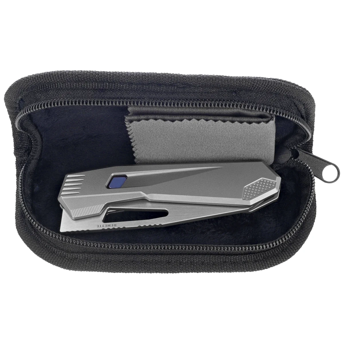Rękojeść - egzoszkielet z tytanu 6AL4V, do którego przymocowano frezowaną CNC osłonę z tego samego materiału. Powierzchnia wykończona metodą Ceramic Sandblasting zwiększa odporność na zużycie i ułatwia chwyt nawet przy wilgotnych dłoniach. Mechanizm z przyciskiem umożliwia szybki demontaż okładzin – istotne dla użytkowników dbających o konserwację. Konstrukcję uzupełnia klips deep carry z tytanu w układzie tip-up oraz otwór na smycz. Całość dostarczana jest w markowym etui nylonowym, które zapewnia bezpieczne przenoszenie noża na co dzień i w podróży.