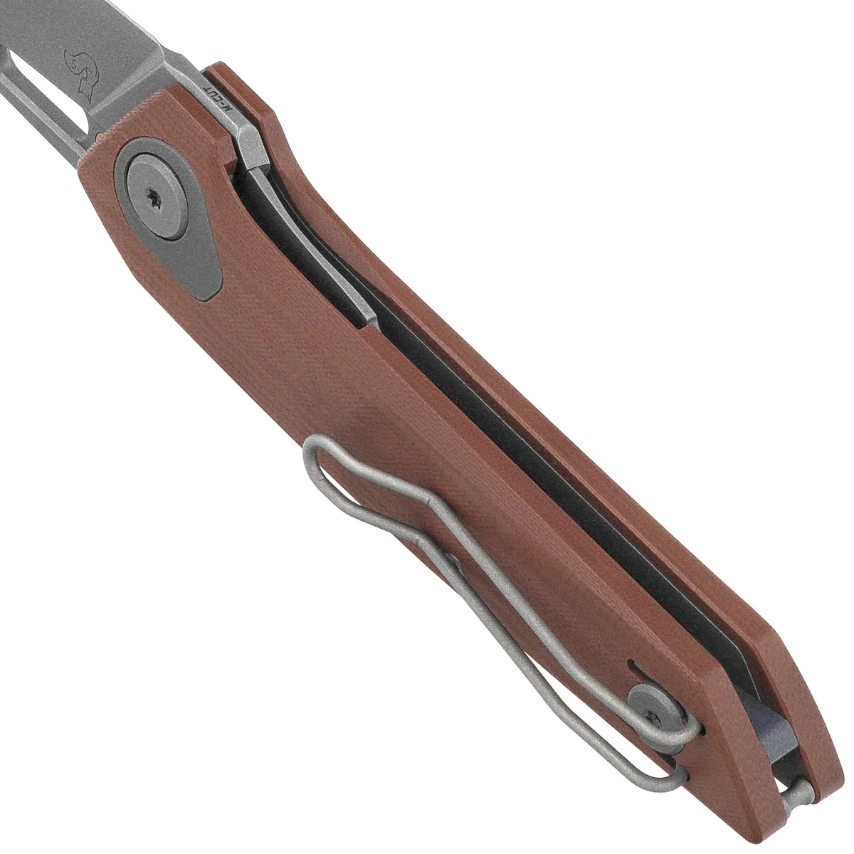 Rękojeść - okładziny z kompozytu G10 zostały precyzyjnie wyfrezowane i osadzone na stalowych linersach, co gwarantuje trwałość i odporność na czynniki zewnętrzne. Teksturowana powierzchnia poprawia właściwości antypoślizgowe, nawet przy wilgotnej dłoni. Smukła forma wspiera komfortowy chwyt, a niskoprofilowa budowa rękojeści ułatwia przenoszenie w kieszeni. W tylnej części znajduje się przelotka na linkę, a z drugiej strony, klips typu wire deep carry, który zapewnia niską widoczność podczas noszenia. Charakterystyczna, designerska śruba pivota.